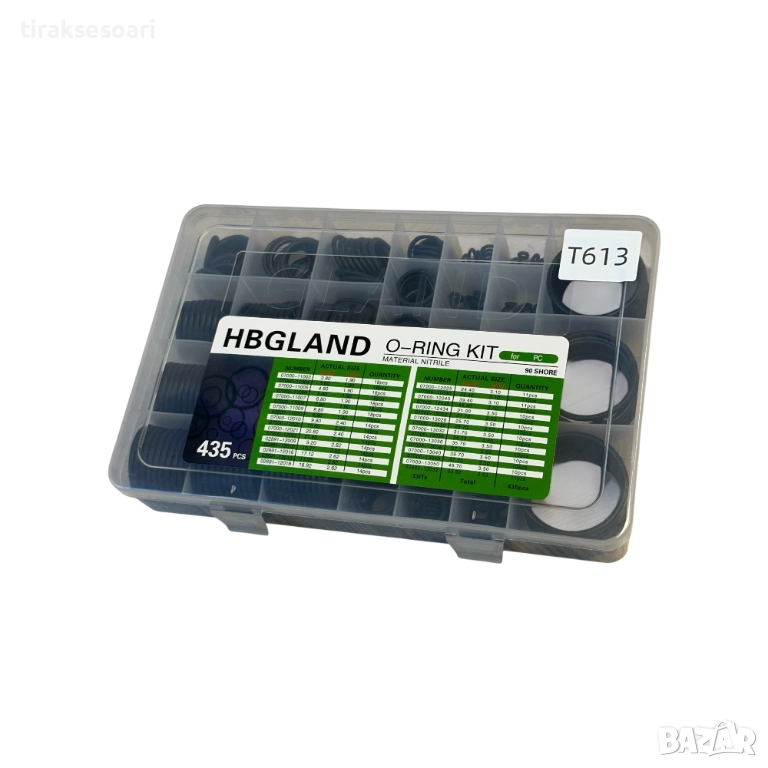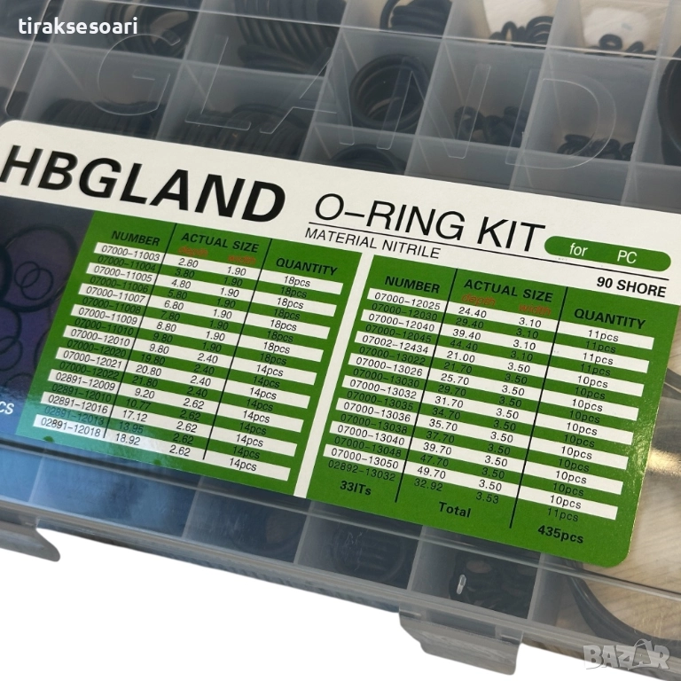 Комплект О-пръстени HBGland – 435 броя в практична кутия с отделения. Изработени от нитрилен каучук (NBR) с твърдост 90 Shore. Подходящи за PC, автомобилни, хидравлични и пневматични приложения. Устойчиви на масла, горива и износване.