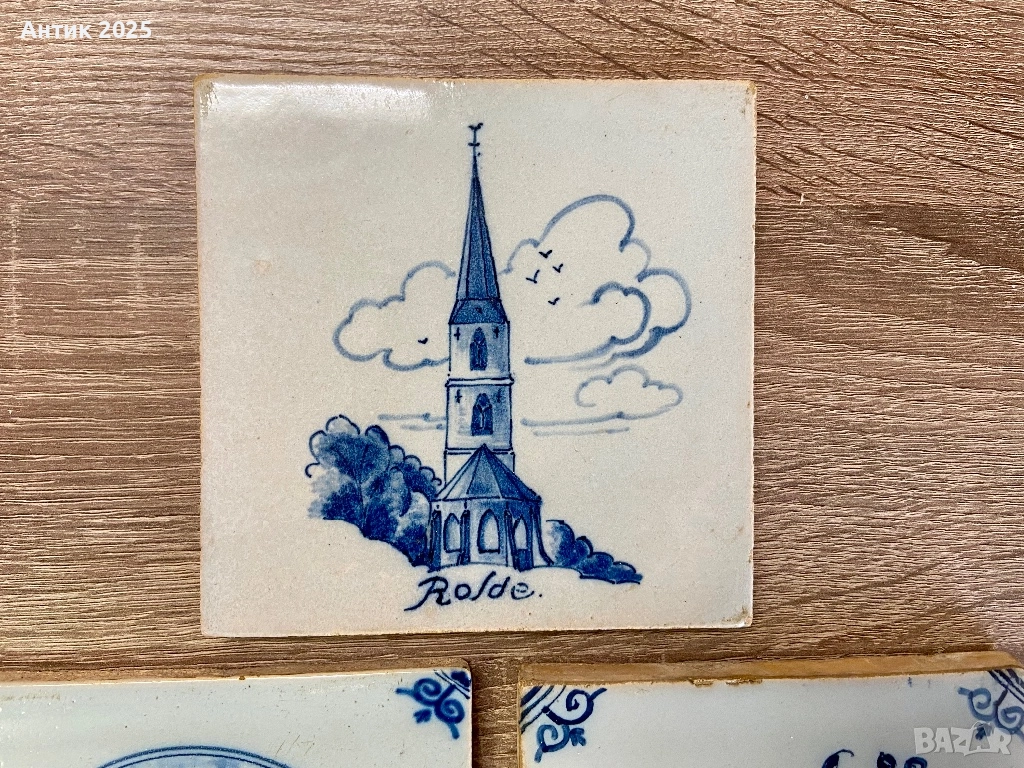 плочки в класическата синьо-бяла цветова гама, вдъхновена от холандския стил Delft Blue. Изображенията – ветроходен кораб, вятърна мелница, селски пейзаж, птица и кула с надпис „Rolde“ – създават типична нидерландска атмосфера и изглеждат чудесно в интериора, поставени на стена или в ниша. Плочките са изработени от глазирана керамика с прецизна ръчна декорация и характерни орнаментални ъгли, което ги прави интересни за колекционери и любители на холандския декор. Комплектът е подходящ за кухня, всекидневна, кафене или ваканционен дом, както и като приятен винтидж подарък.