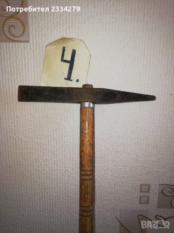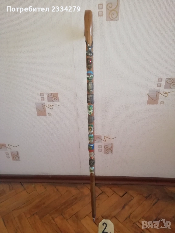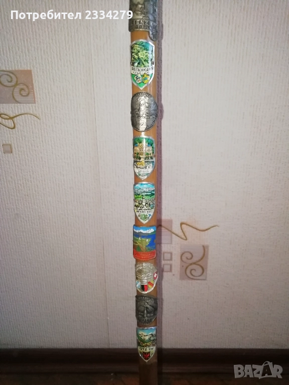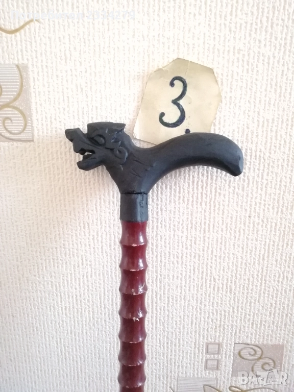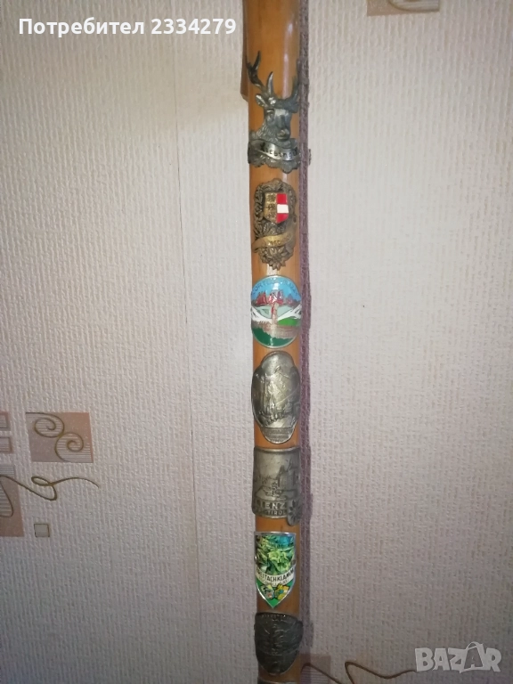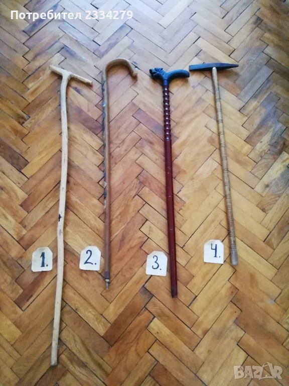 N:1 стар бастун гега, ръчно дялан в миналото от дрян, дължина 1м.10см., цена 2€., декорация за битова къща, механа, ползване; N:2 стар автентичен туристически Тиролски или алпийски бастун с връх отдолу и наковани 13 емблеми на планински селища, планини хижи, дължина 90см., цена 18€.; N:3 стар бастун с дръжка дърворезба с фолклорен мотив ,,ламя, халба, дракон", дължина 90см., цена 8€.; N:4 стар туристически алпийски бастун, дърво и метал, размери 80х20см., цена 8€.