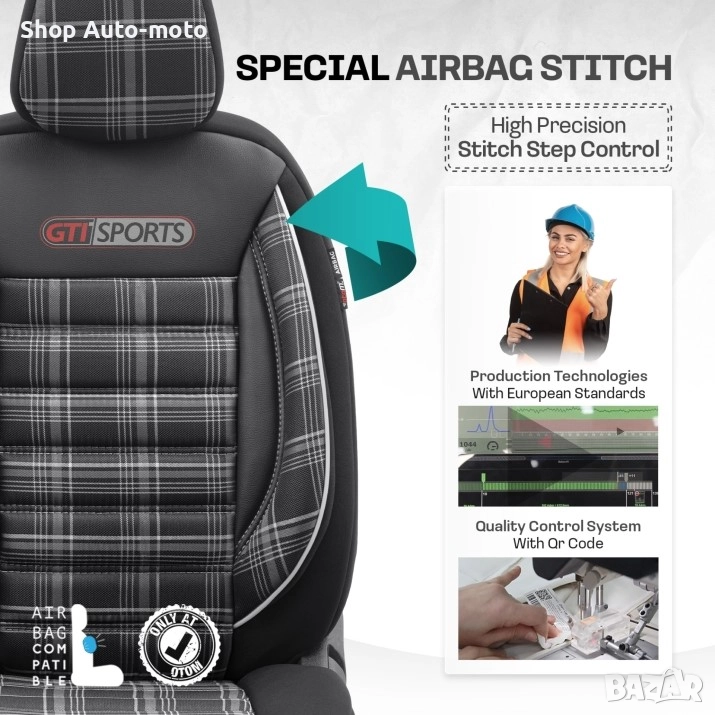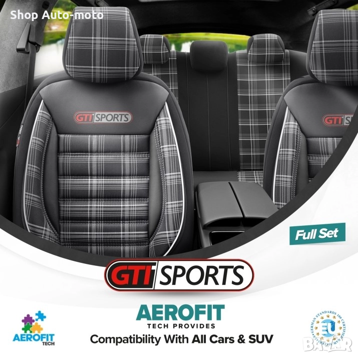 К-т Луксозна Тапицерия Automat-OTOM, Текстил с еко кожа, GTI SPORTS Design – Черна с бял шев.