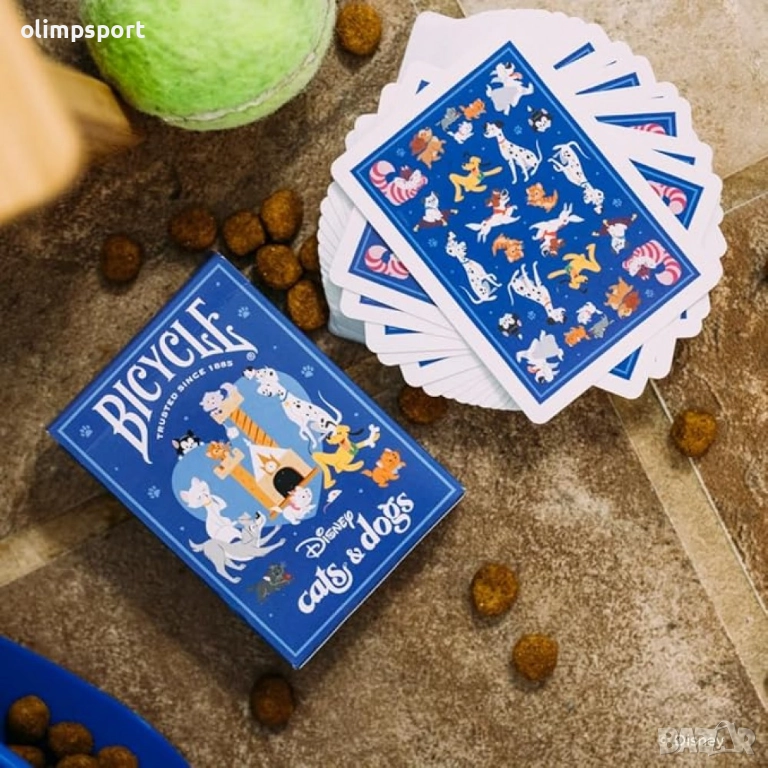 Картите за игра, вдъхновени от Disney Cats and Dogs, от Bicycle, съдържат 56 карти с размер за покер, включително 2 Dжокера + 1 карта Bicycle и 1 карта Disney Cats and Dogs.