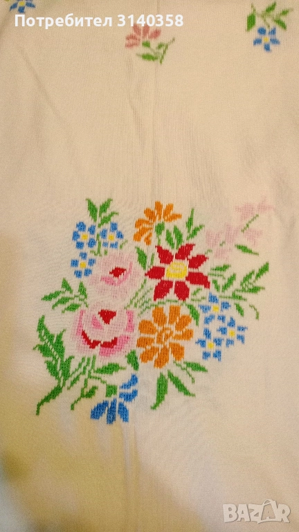 Бродирани покривки- снимка1-130/140 см, бродерия от всички страни-90лв, сн.2 и 3-150/140 см, бродерия от всички страни -68 лв, сн.4-200/160см, бродерия от едната дълга страна-64 лв. Всички покривки имат ръб по средата по дългата страна. Сн.5-75/180 см с ресни на двете тесни страни. При интерес мога да пратя снимки на цялата покривка. За количество - отстъпка.