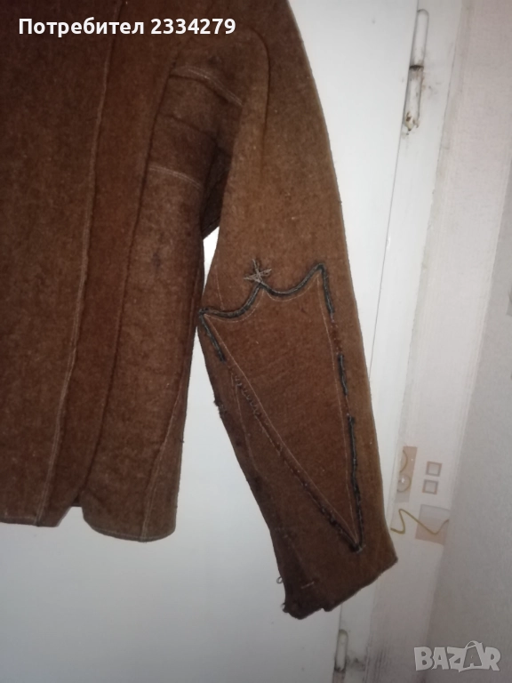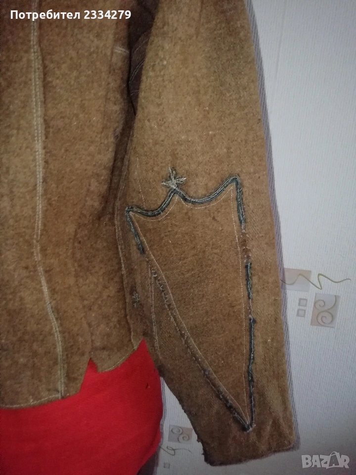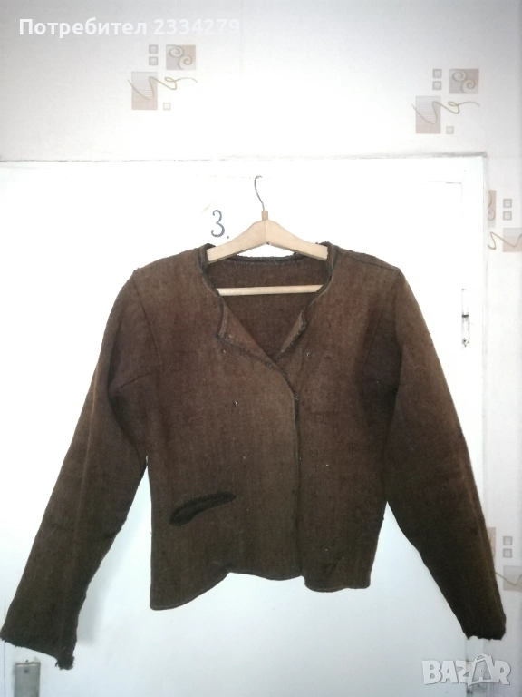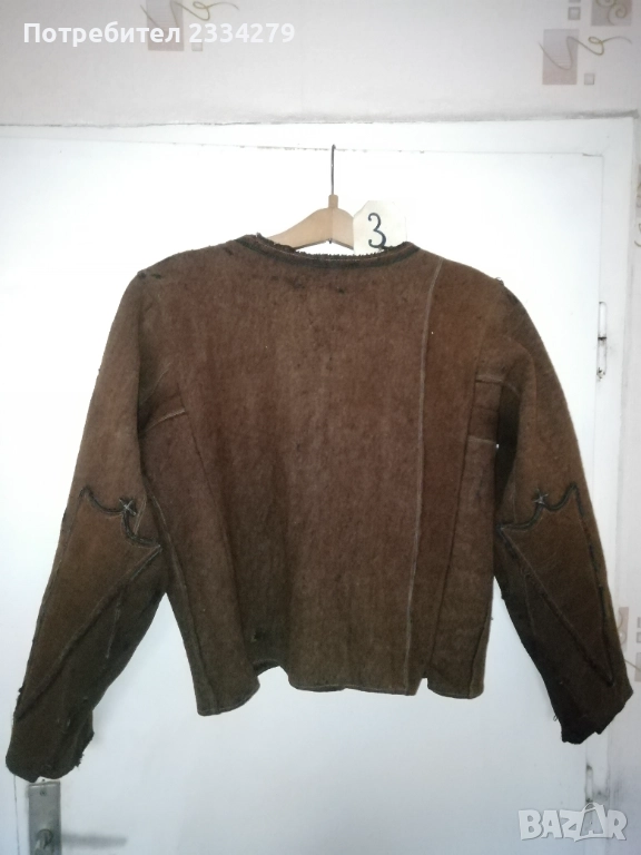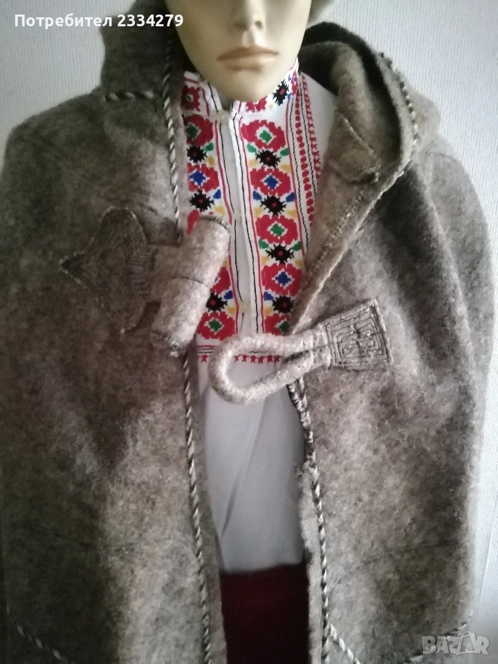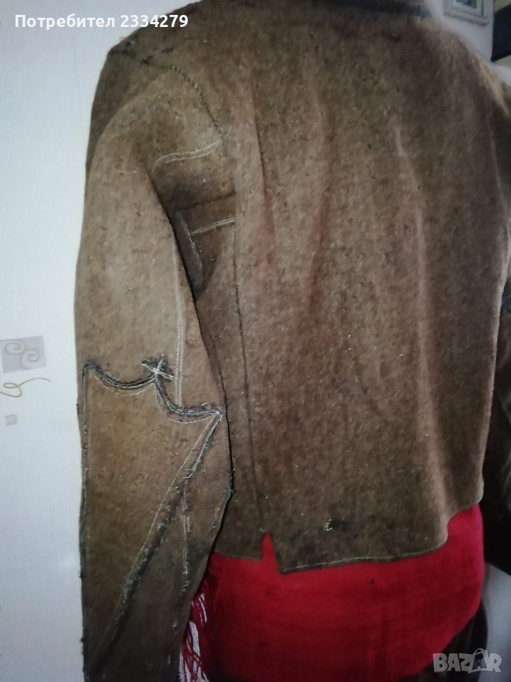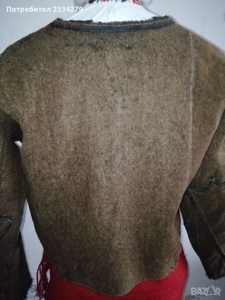 носия антерия, шита от аба, ръчно тъкан от чиста вълна, обкраена с гайтани, закопчаването на две страни с телени копчета, размери: дължина 55см., широчина рамена 47см., цена 25€.,има забележки, проядено не е реставриран, декорация за механа, битова къща.