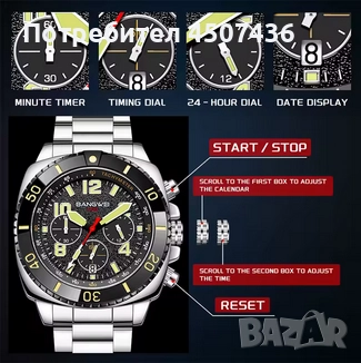 Многофункционален хронограф: Оборудван със секундни, минутни и часови хронографи за прецизно отчитане на времето.