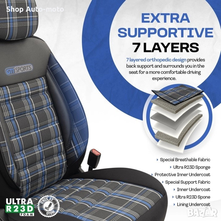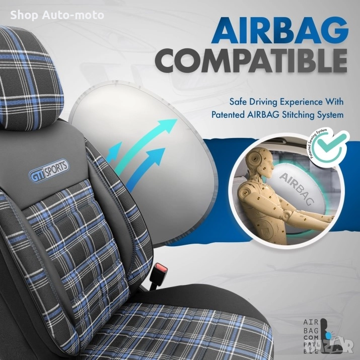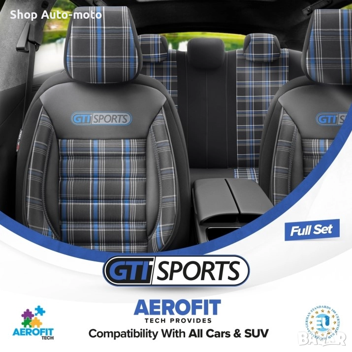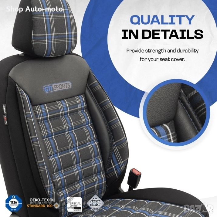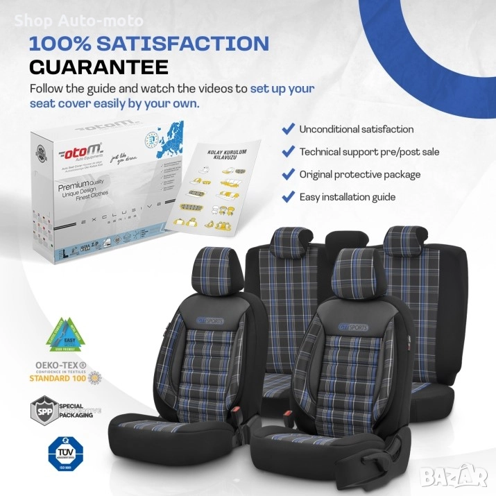 К-т Луксозна Тапицерия Automat-OTOM, Текстил с еко кожа, GTI SPORTS Design, Черна със син шев.