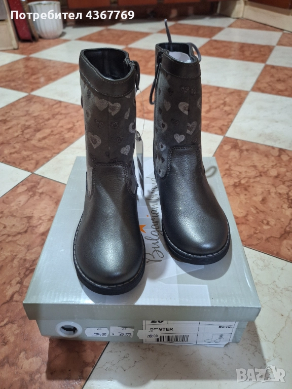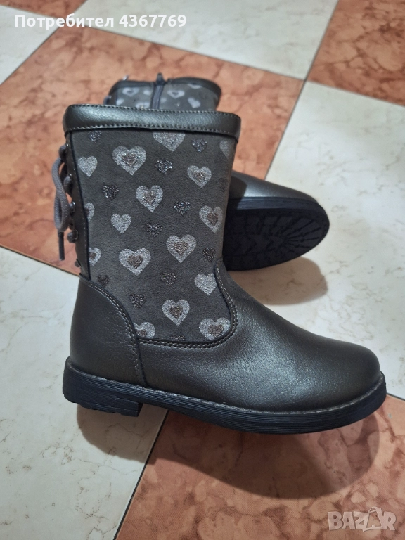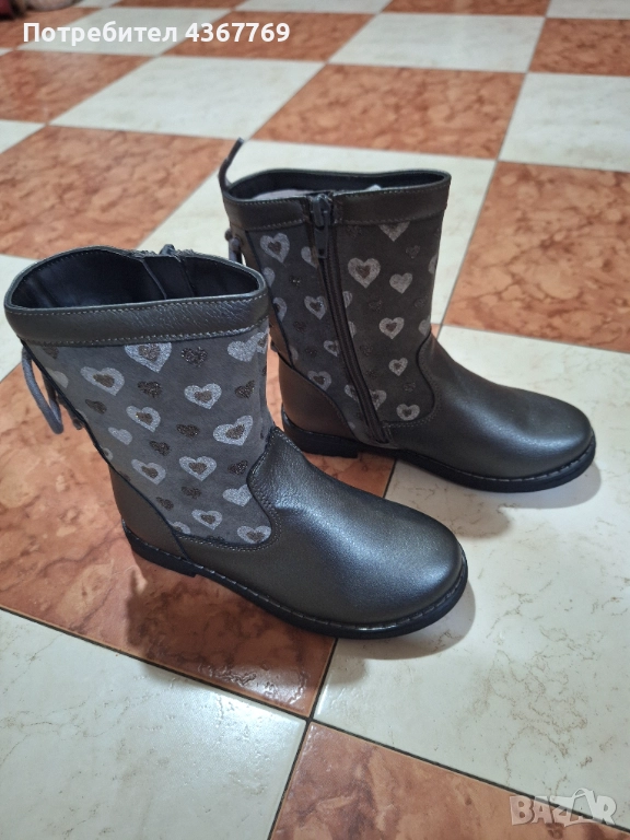 Детски зимни ботушки на Мат Стар. Отвътре имат мълна,за да са топли. От вътрешната страна имат цип за лесно обуване. Шити и липени. Ботите са в сив цвят и са обсипани с множество сърчица. Отговарят си на размера.