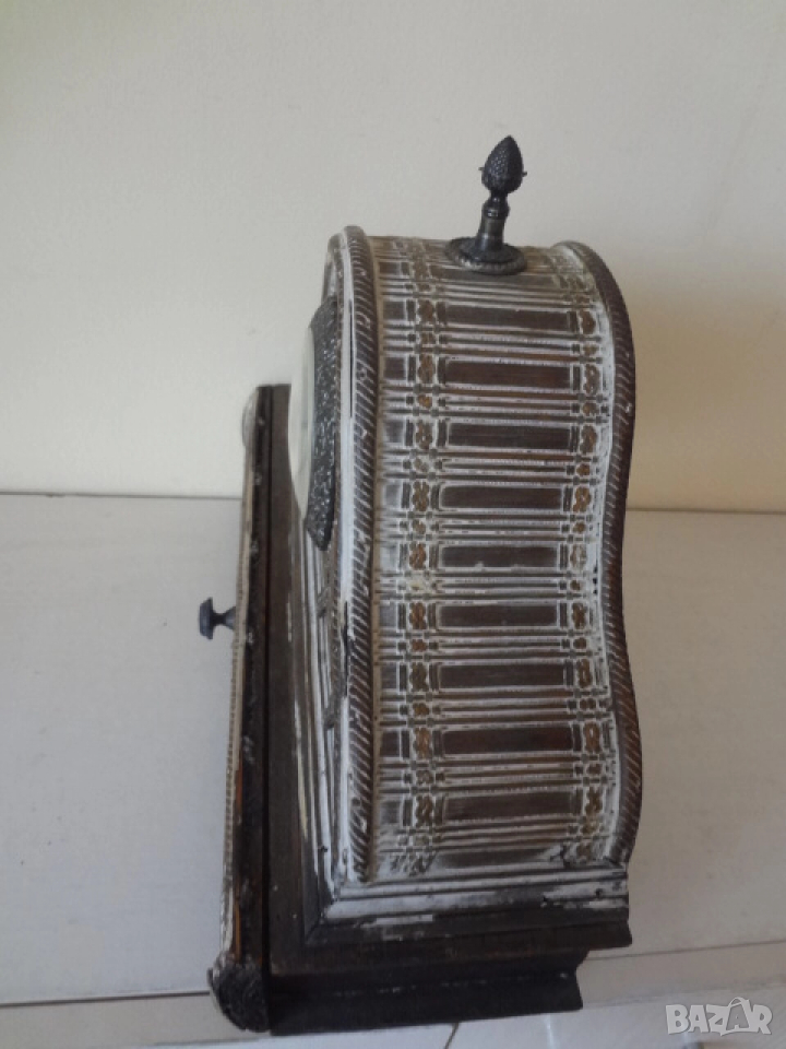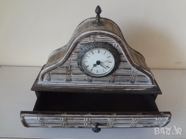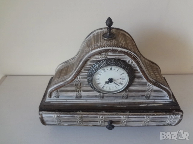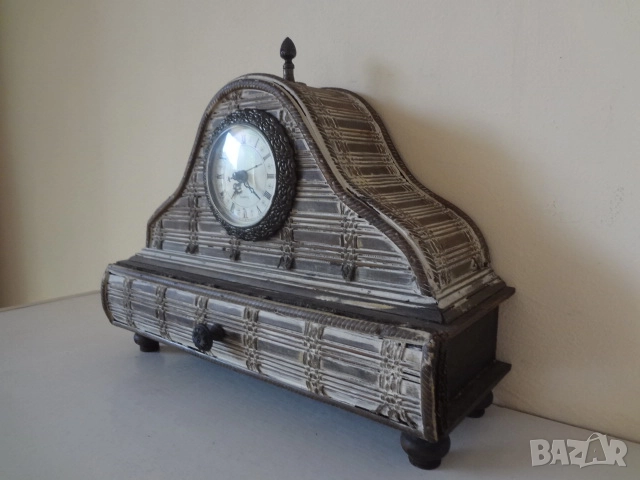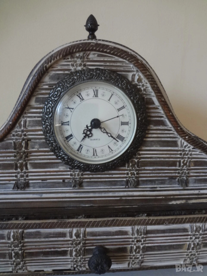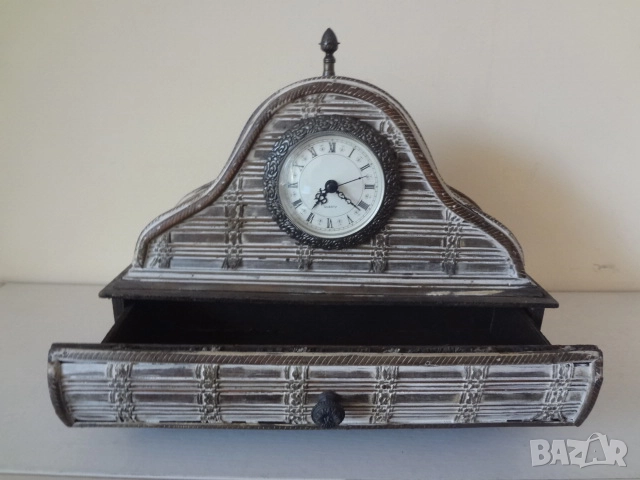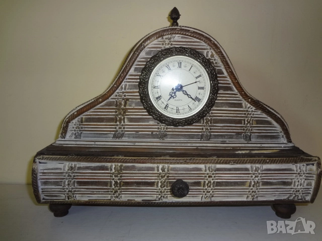 Нов винтидж настолен часовник донесен от Америка. Изработен е от множество малки дървени пластини и му е придаден много интересен и оригинален старинен и античен външен вид. Има кварцов механизъм и работи с 1 бр, малка батерия - 2А . Един страхотен аксесоар за дома, който може да бъде поставен върху камината , на тв шкафа, секцията или в механата. Размери - височина - 30 см.; дължина - 32 см.; дебелина-12 см.