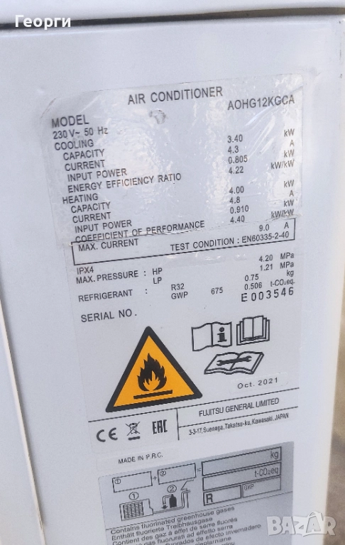 Параметри на климатизатора при 35°C външна температура (27° в помещението):Захранващо напрежение: 220V