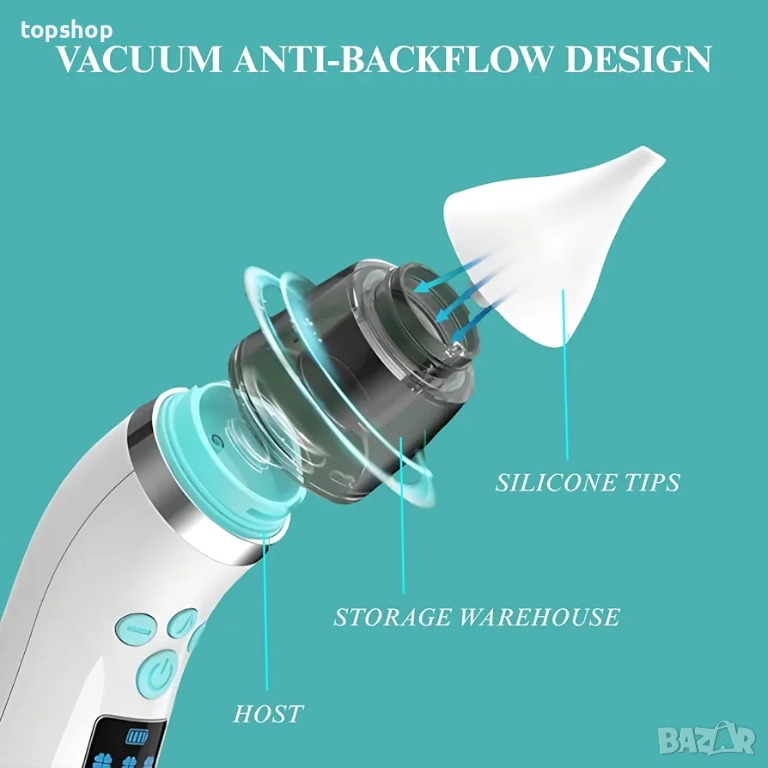 Електрически назален аспиратор X10, корпус от ABS, 2 меки силиконови накрайника, 3 регулируеми нива