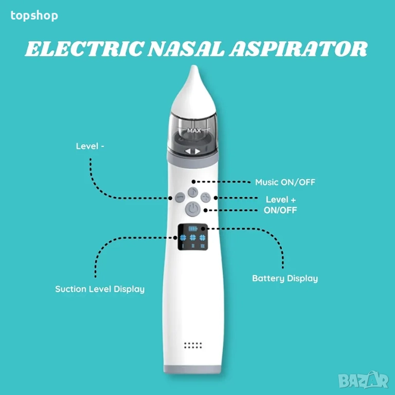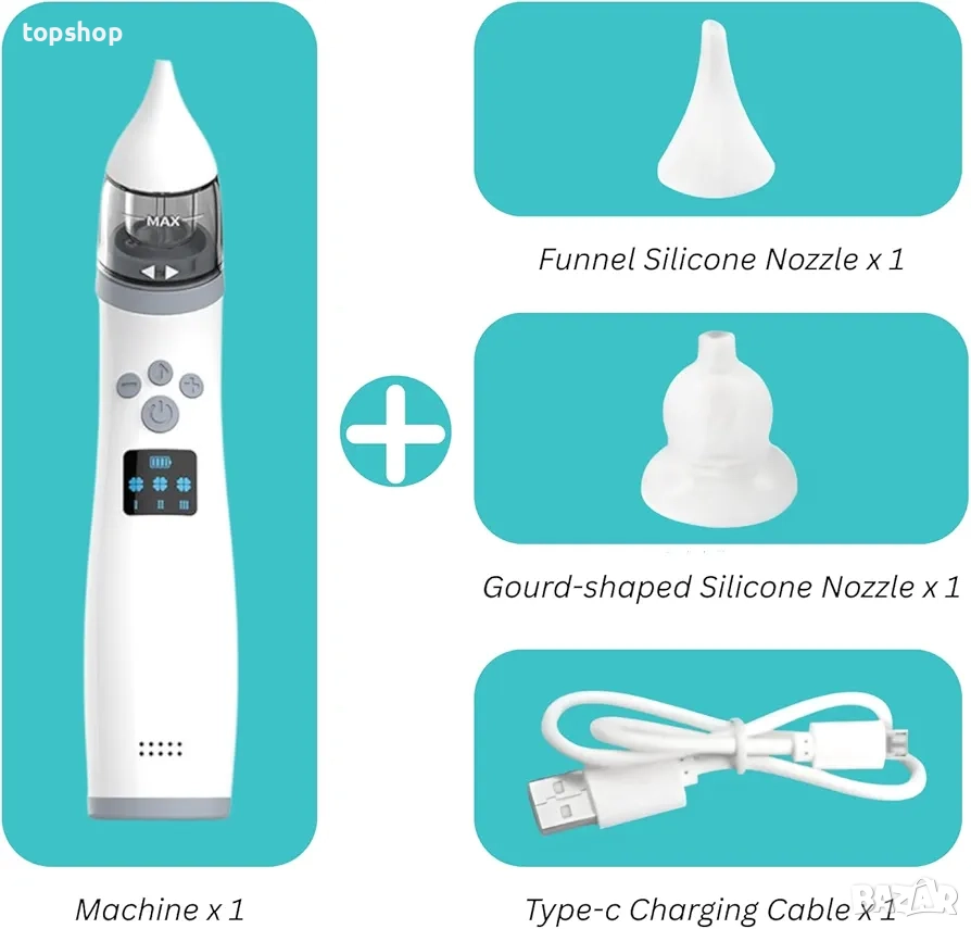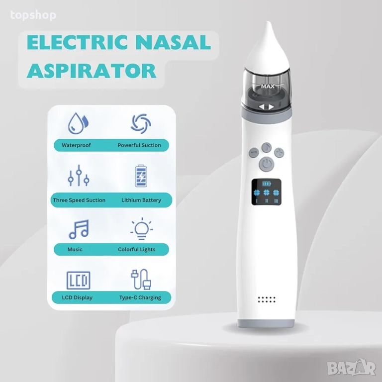 Електрически назален аспиратор X10, корпус от ABS, 2 меки силиконови накрайника, 3 регулируеми нива на засмукване, презареждаем USB-C, назален почистващ препарат, тих мотор, автоматично изключване, успокояваща музика, бебешки почистващ препарат за нос