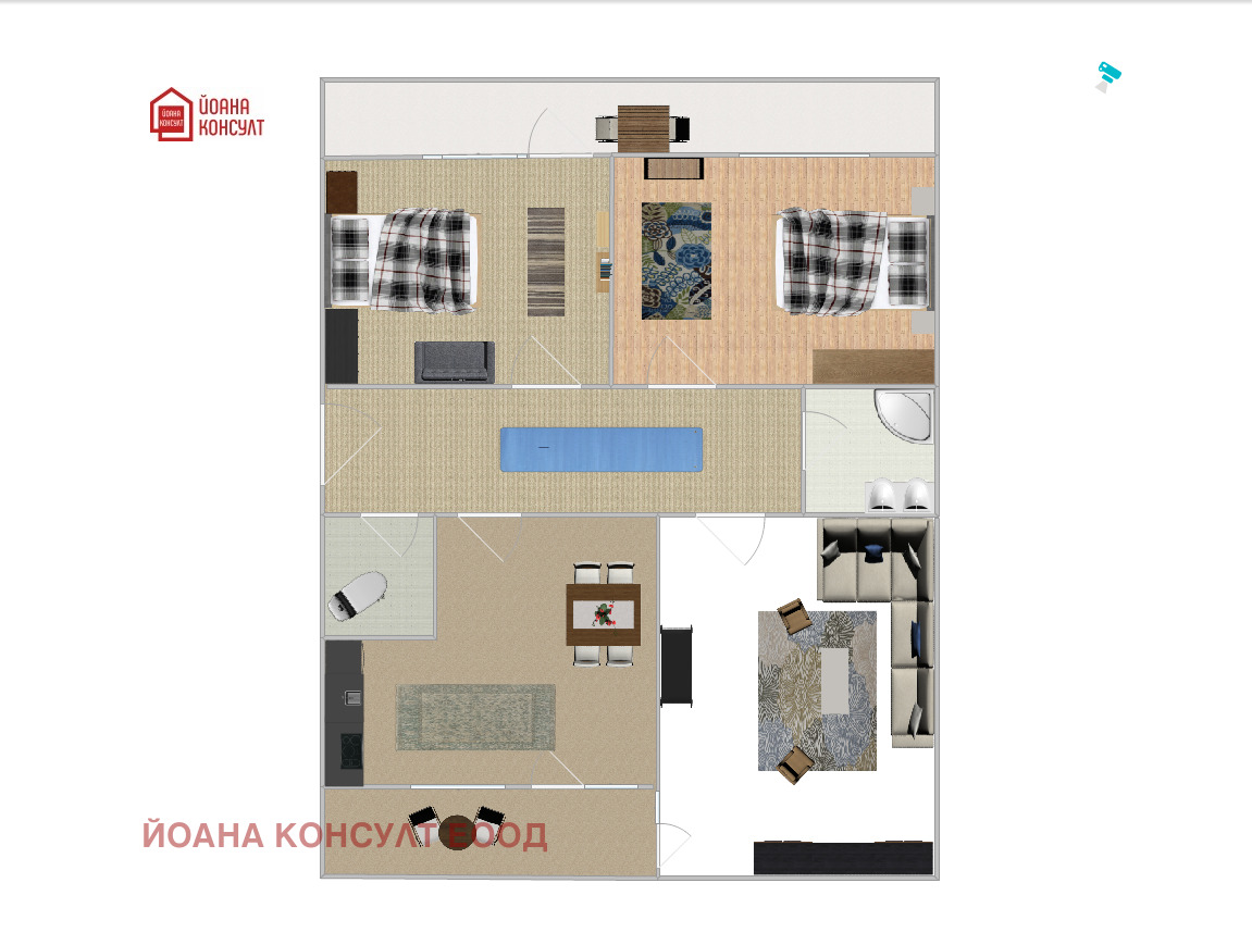 Жилището се състои от две спални, просторен хол, кухня с трапезария, баня, отделна тоалетна, широк коридор и две тераси, които осигуряват допълнително пространство и светлина. Към апартамента има и маза с площ 12 кв.м., както и таванско помещение от 9 кв.м.