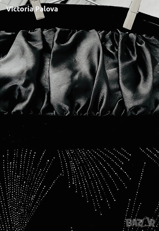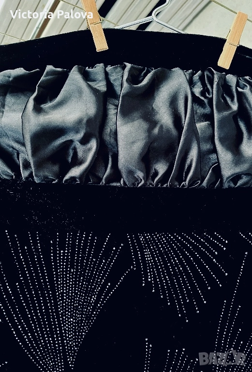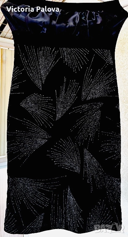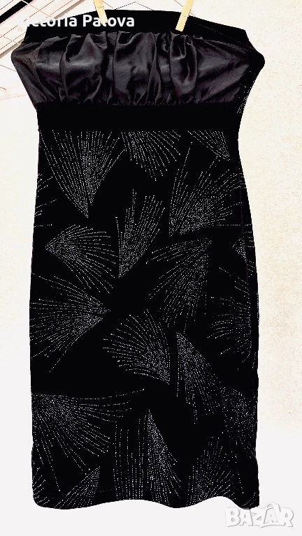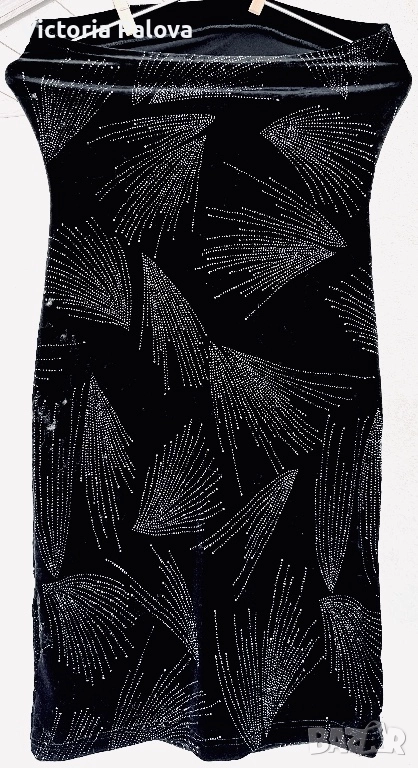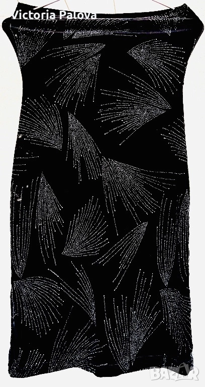 Къса strapless мини рокля в луксозно черно кадифе с впечатляващи сребристи кристалчета, подредени в елегантни арт деко мотиви - ветрила и абстрактни листни форми. Декорацията е симетрична и създава зашеметяващ блясък при всяко движение и светлина. Материята е мека и плътна с отлична разтегливост, роклята приляга идеално по тялото, подчертава формите и осигурява комфорт. Идеален избор за парти, Нова година, рожден ден или специален повод - класическо черно с блестящи акценти, което гарантира ефектен и запомнящ се вид. Комбинира се добре с токчета, минималистични обеци и ярък грим. ГО горе - 36см в неразтегнат вид, дължина - 77см.