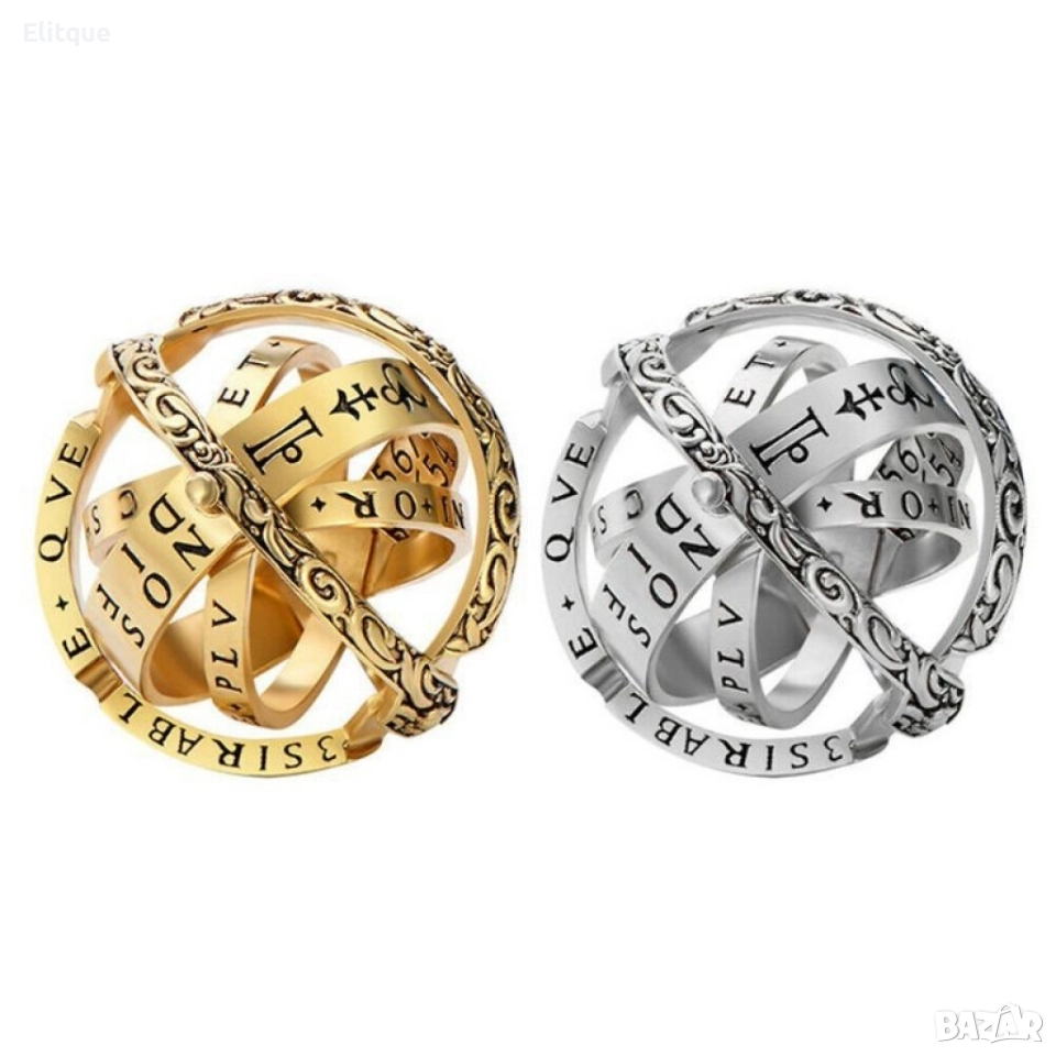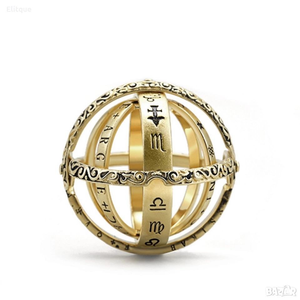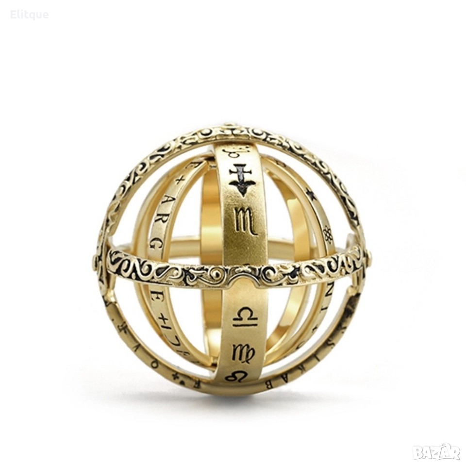 Сферично зодиакално колие - пръстен, различни размери / Материал на изработка: висококачествени материали: неръждаема стомана; Няколко ринга, които лесно се разгръщат в ефектна сферична форма; Зодиакални елементи; Може да се използва и като висулка за колие и като пръстен; Цвят: златисто покритие, сребърно покритие; Размери: 6, 7, 8, 9, 10, 11.