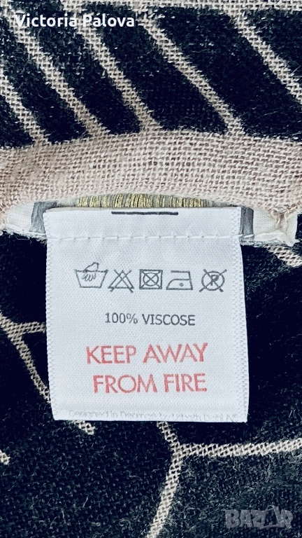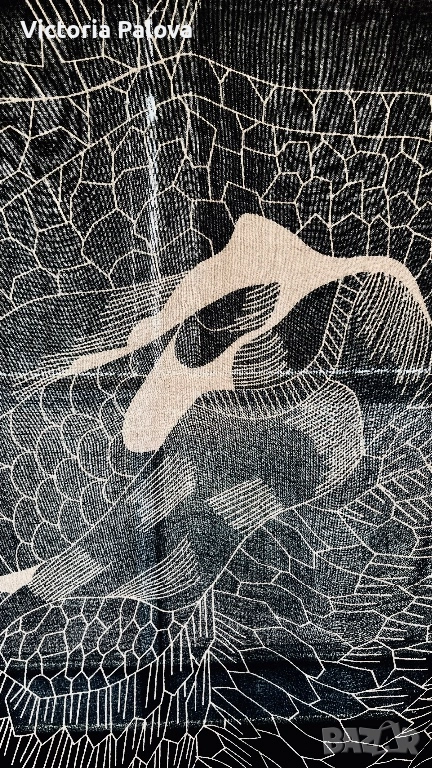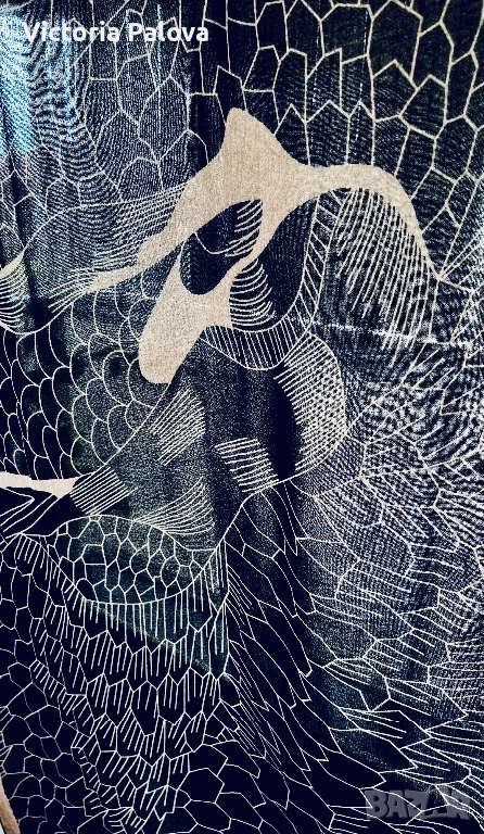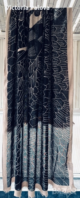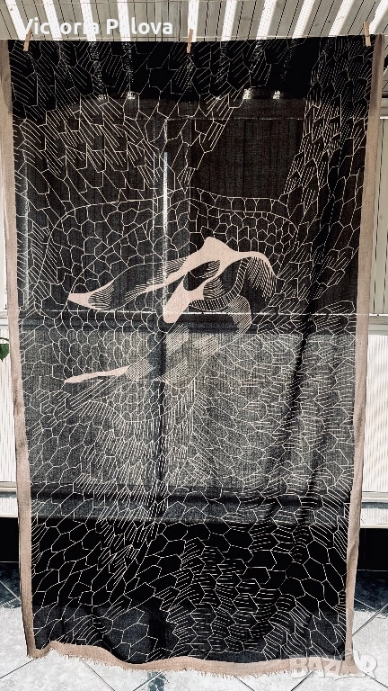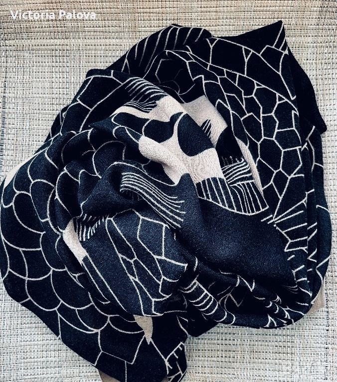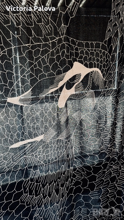 Уникален авторски принт от Lisbeth Dahl - стилизирани летящи птици ( жерави или лебеди) на абстрактен фон от радиални линии и геометрични вълни. Цвят черно с бежови акценти, асиметрично разположение за динамичен ефект. Размерът е oversized - идеален е за драпиране - лек и течащ плат с мека копринена текстура. Приятен на допир, дишащ, подходящ за целогодишно носене. 200см на 110см.