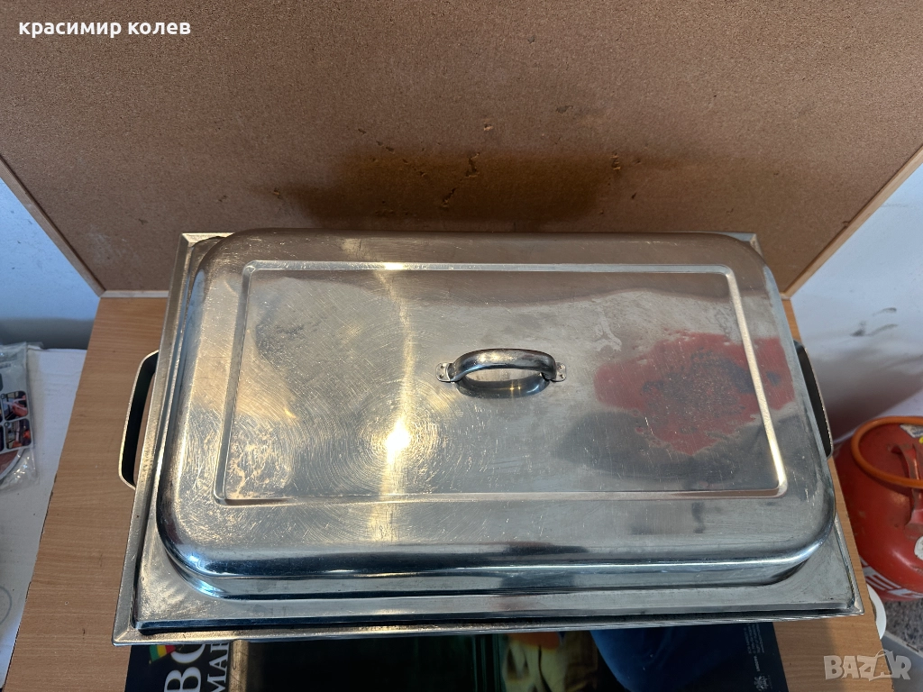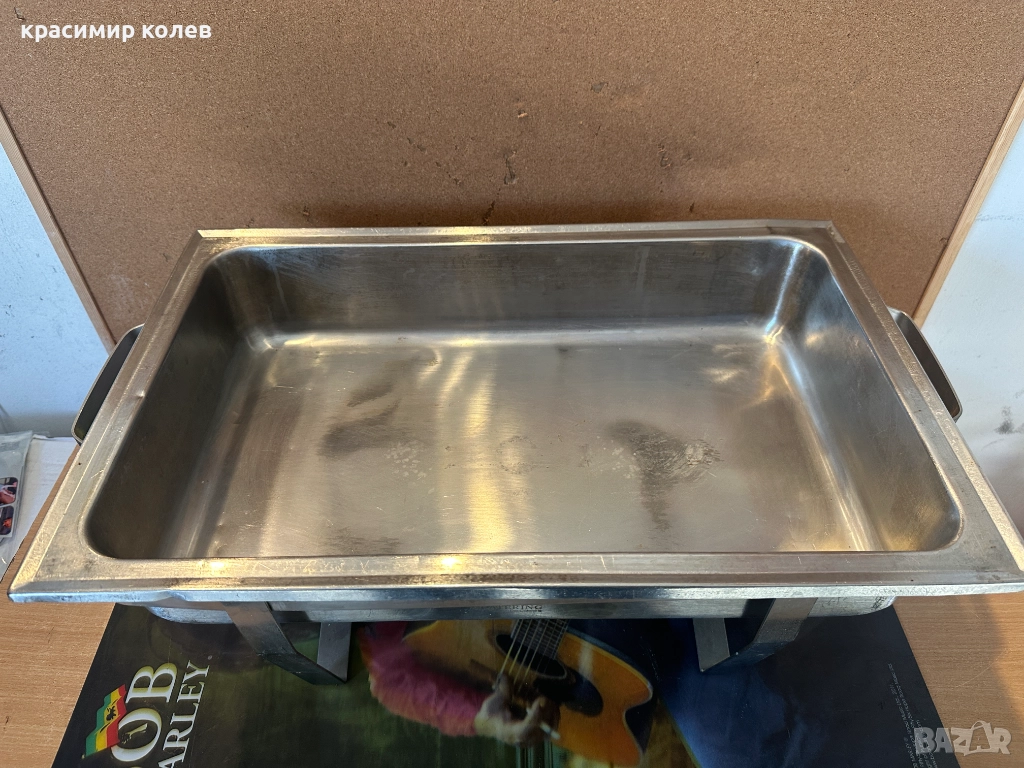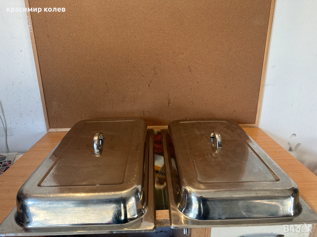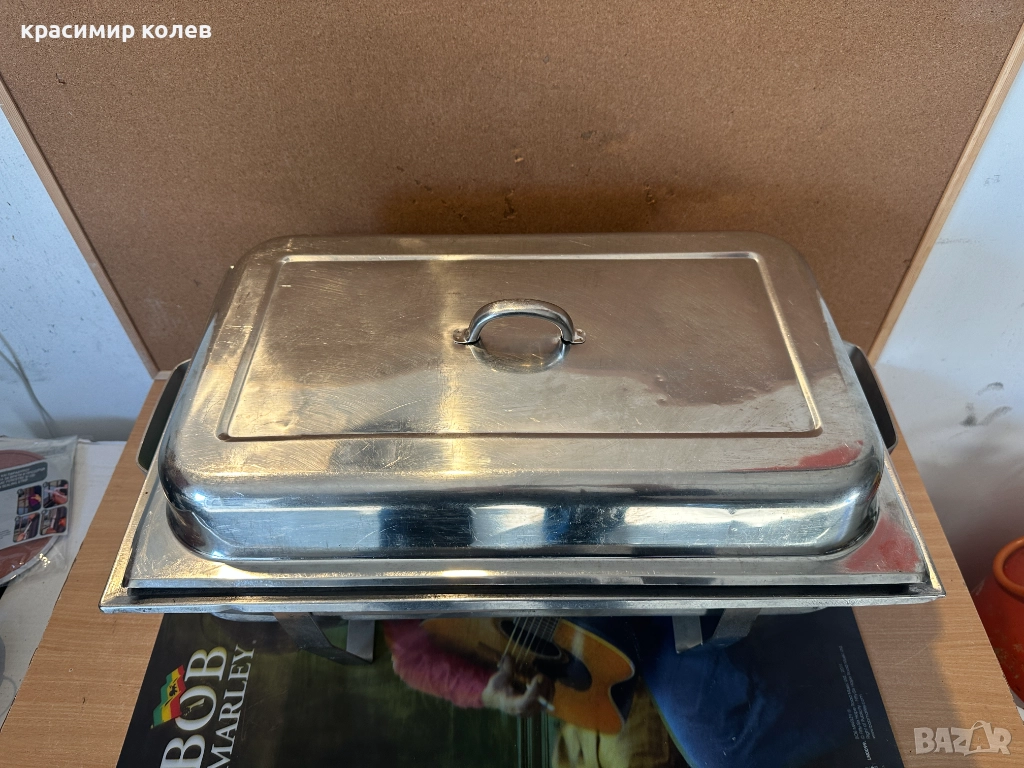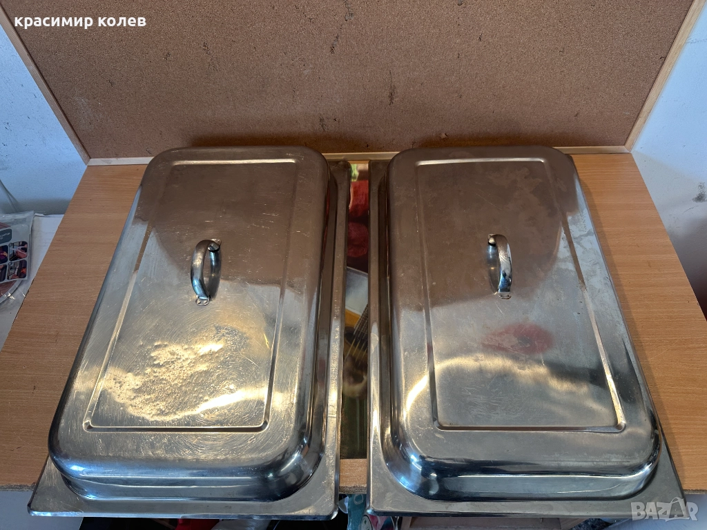 Изработено от неръждаема стомана.Състои се от поставка две тави и два капака.Използван най-често в кетъринг, ресторанти, хотели и на бюфети.Предназначение: поддържа ястия като месо, ориз, зеленчуци, сосове топли за дълго време.Габаритни размери дължина 55 см., широчина 35 см. и височина 30см.