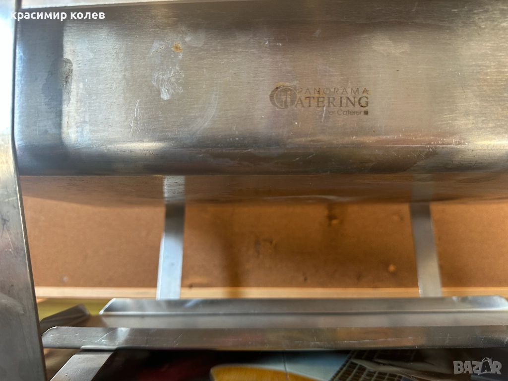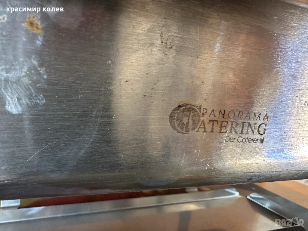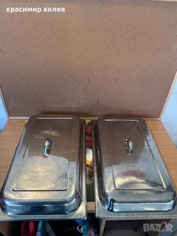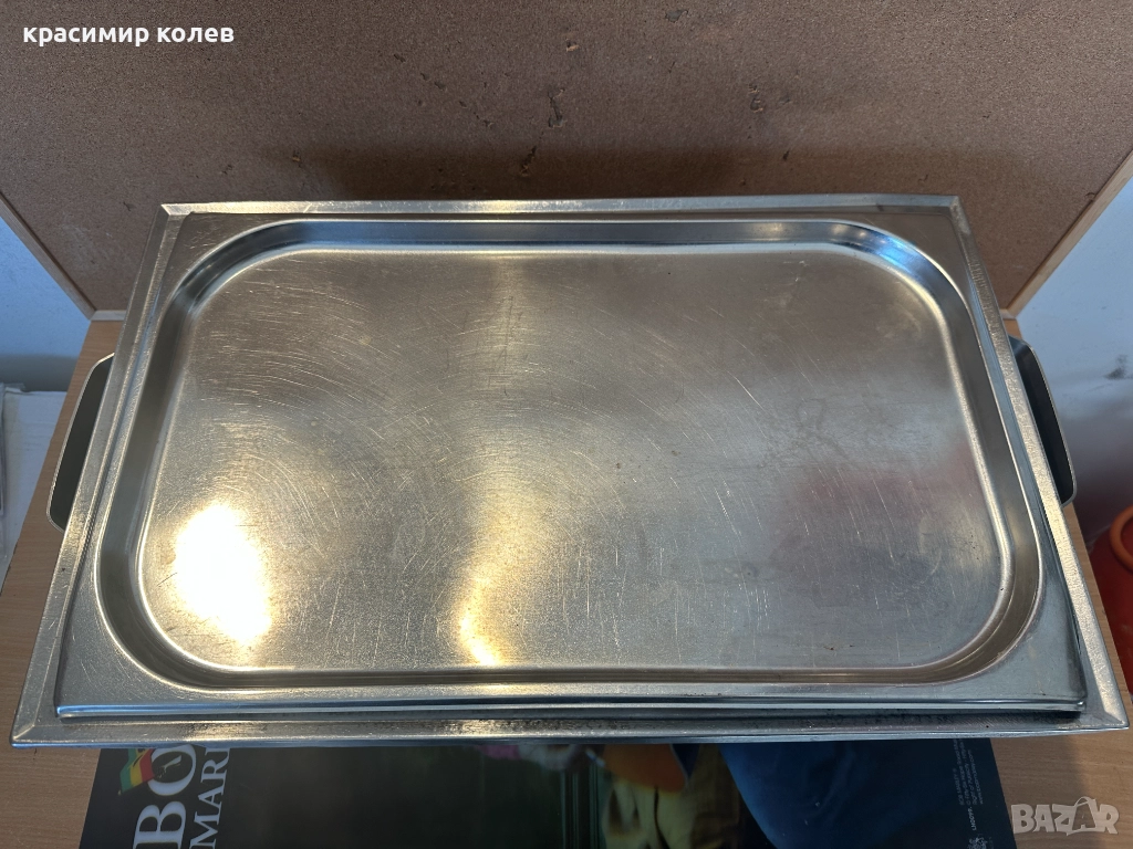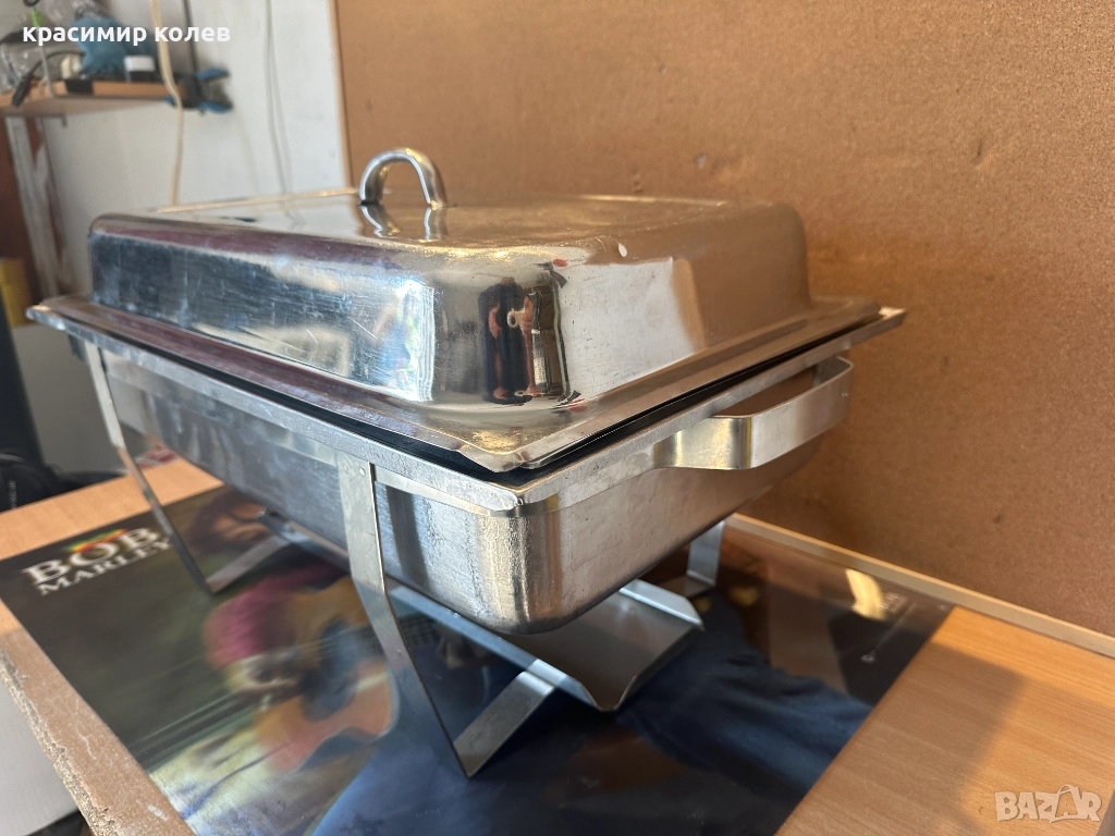 Изработено от неръждаема стомана.Състои се от поставка две тави и два капака.Използван най-често в кетъринг, ресторанти, хотели и на бюфети.Предназначение: поддържа ястия като месо, ориз, зеленчуци, сосове топли за дълго време.Габаритни размери дължина 55 см., широчина 35 см. и височина 30см.