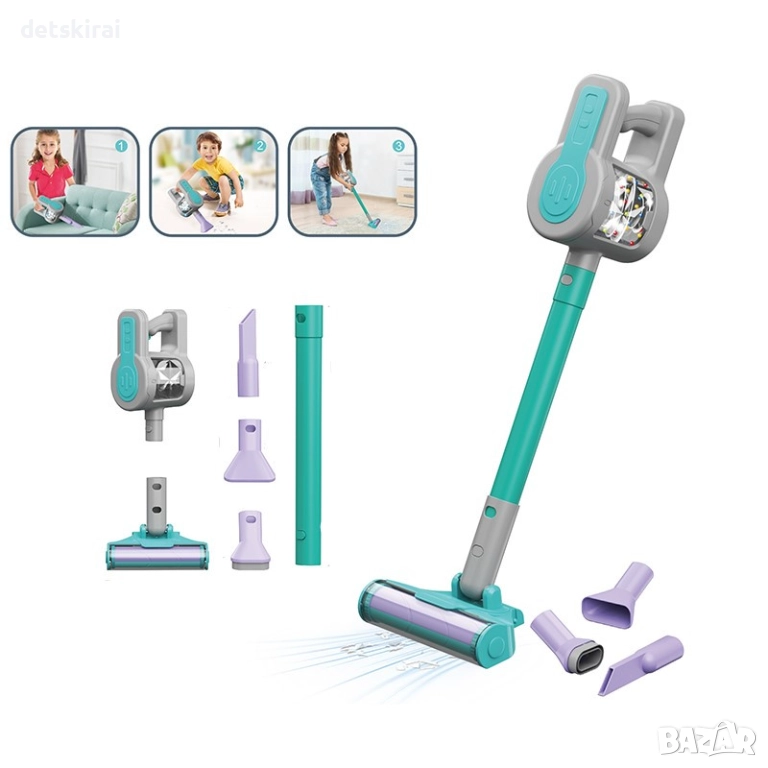 Комплектът съдържа прахосмукачка с четка и три различни накрайника за почистване.