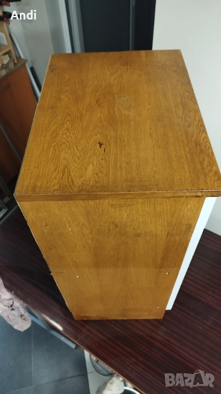 Продавам шкафче ретро соц. модел , Матетиала е ПДЧ с естествен дъбов форнир като корпуса е естествех цвят с лак а вратите са бели .