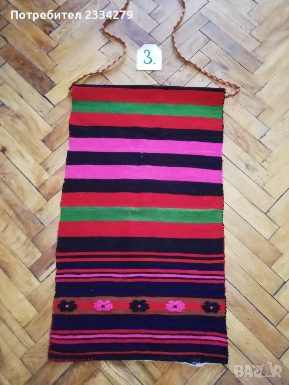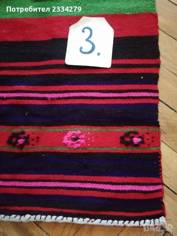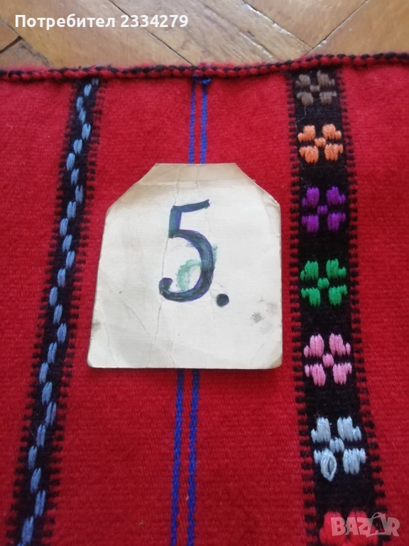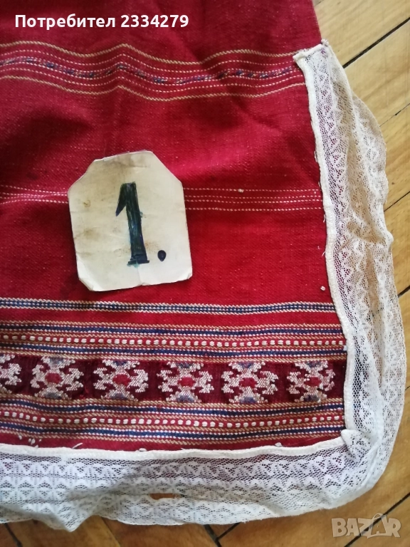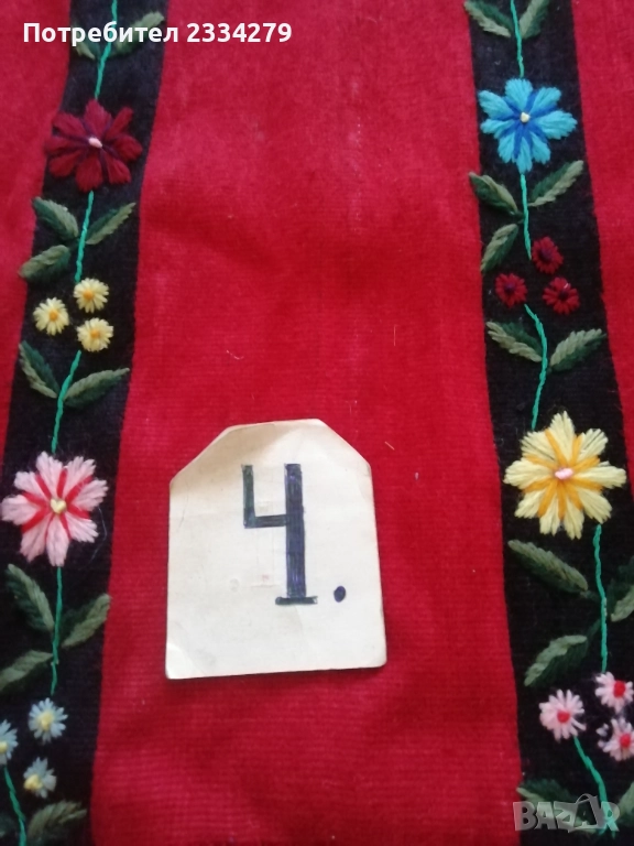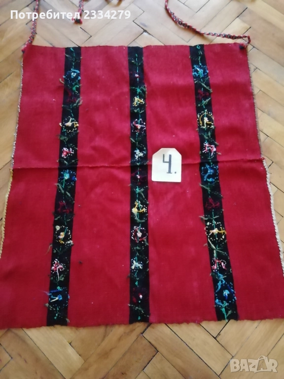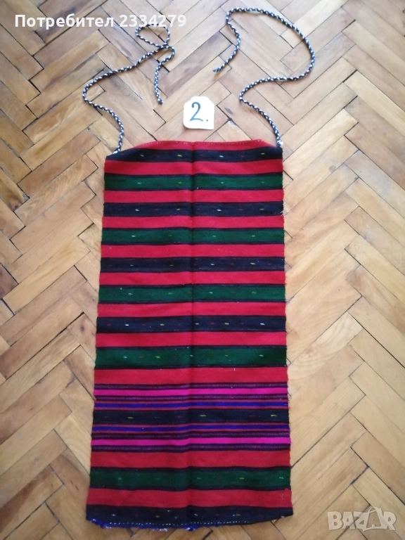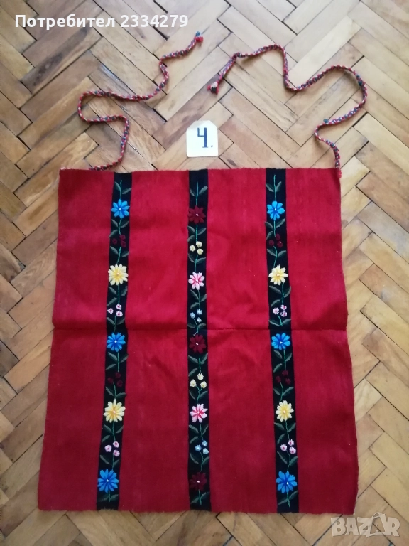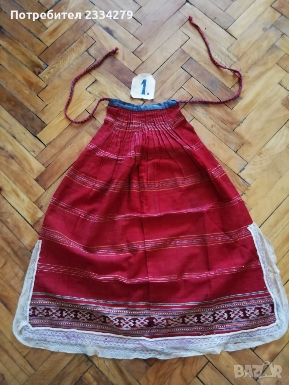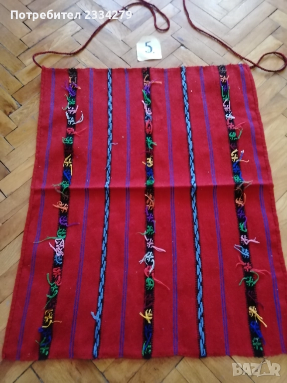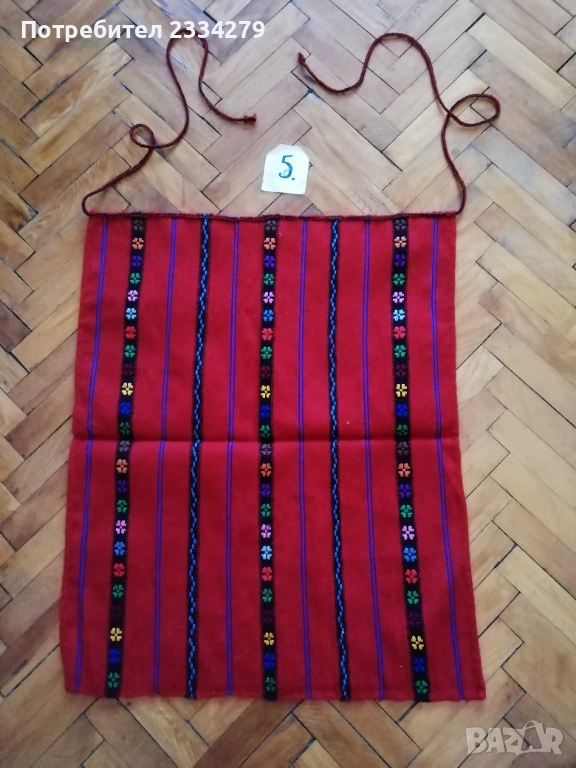 Хърцойска носия, размери 70х65см., цена ; N:2 престилка ръчно тъкана от чиста вълна, размери 75х39см., цена 13€.; N:3 тъкана вълнена престилка, избродирана ръчно, размери 70х43см., цена 13€.; N:4 ръчно тъкана пошивана бродирана престилка, Северозападна България, размери 67х58см., цена 20€.; N:5 Българска традиционна червена престилка с вертикални ивици и бродерии 100% автентичност в много добро състояние, размери 70х58см., цена 25€.