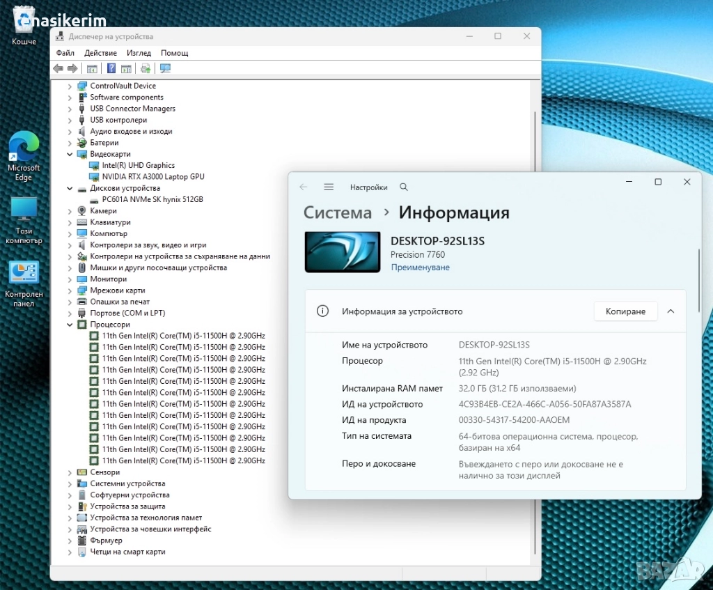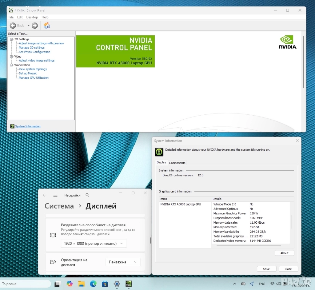 2 видеокарти : Nvidia RTX А3000 192bit 6GB DDR6 собствена памет + Intel UHD Video - up to 24 GB Total Graphics memory.