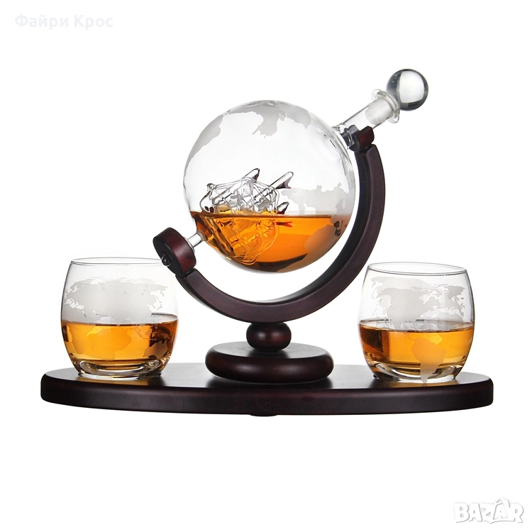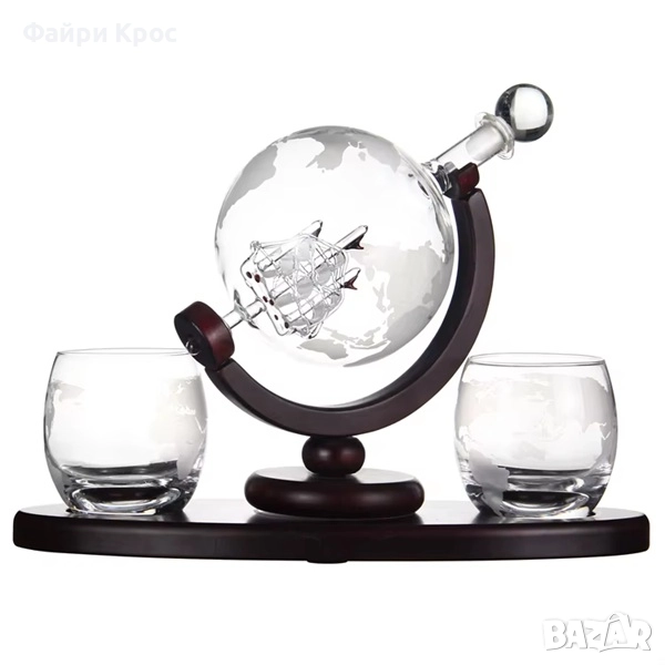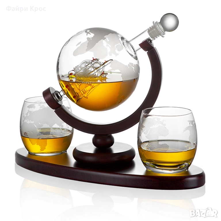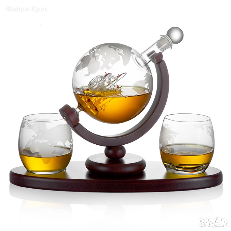 Комплект за уиски с 2 чаши глобус е начин да внесете повече вдъхновение в домашния си бар и пособия за сервиране на питиета, като издига ритуала на съвсем друго ниво. Погледнете снимките само – изящен стъклен глобус със силует на кораб във вътрешността. Готов да съхрани всяка ваша любима напитка. Поставен на подходящ поднос, на който място намират и четири класни великолепни чаши в същата стилистика. Истинско вдъхновение за разговори, специална обстановка, вдъхновена комуникация на всякакви теми с приятели, близки, колеги. Всеки заслужава да има повече красота в живота си. Затова, не правете компромиси и с домашния бар и пособията в него и си осигурете най-доброто.