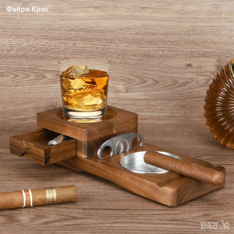 Изключително красива и практична дървена стойка за чаша с пепелник и резачка/ножица за пури 3 в 1: