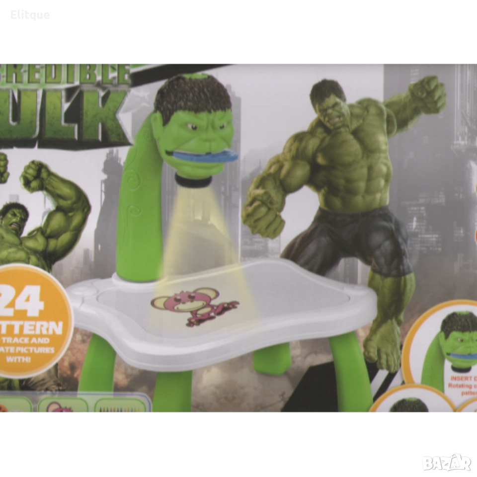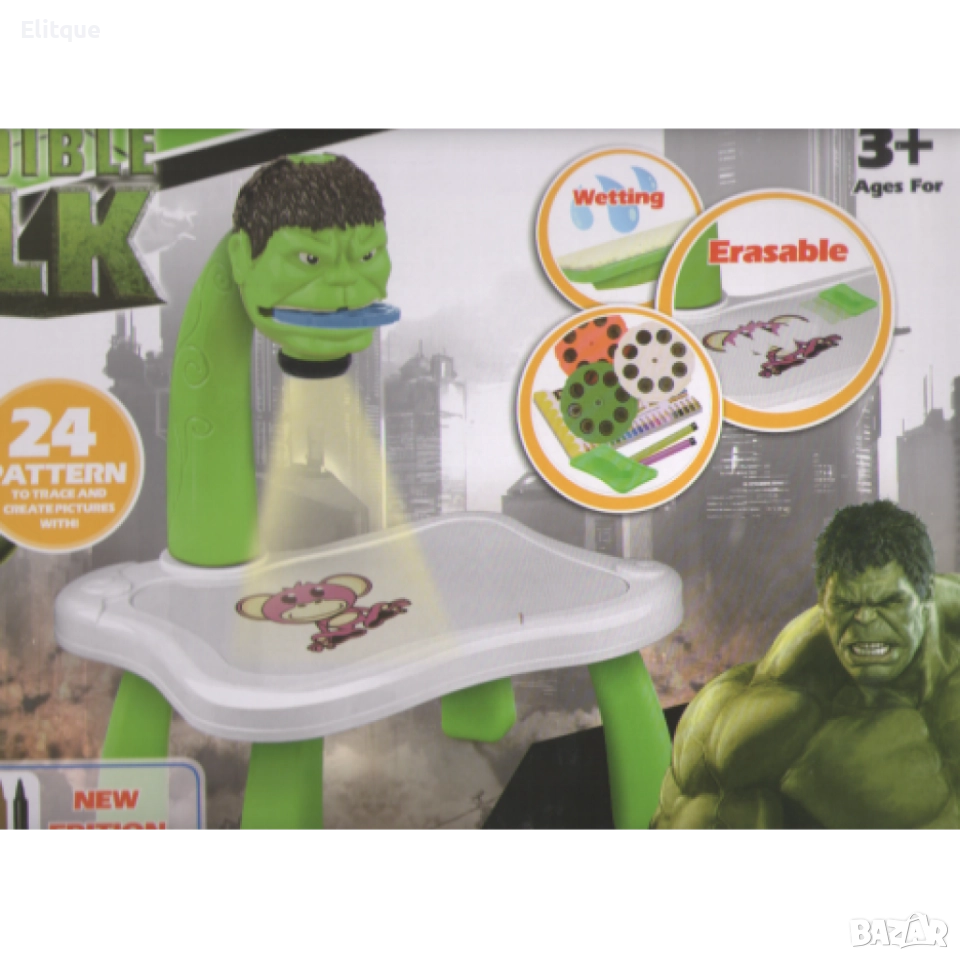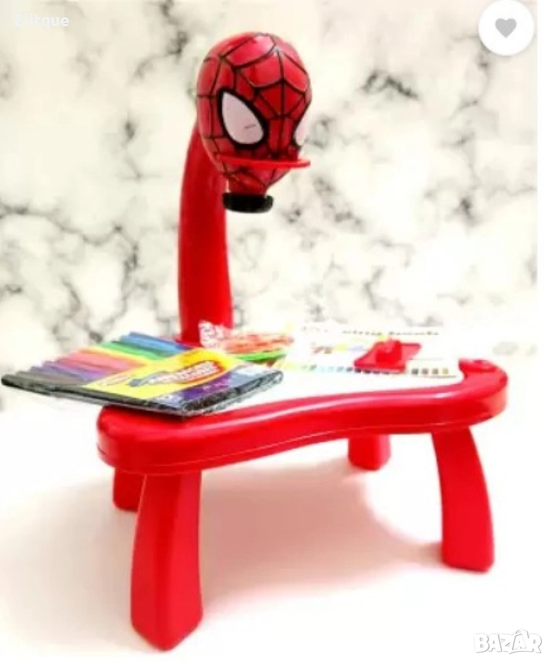 Детска масичка за рисуване с вграден проектор. Размери 39х27х7 см. 24 карти за проектиране, 12 флумастера, 3 диапозитива, 1 блок за рисуване. Подходяща за деца над 3 г! Варианти - Синя - динозавър, Червена - Спайдърмен, Зелена - Хълк