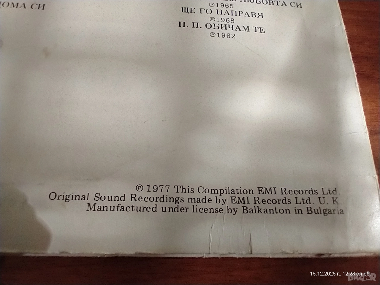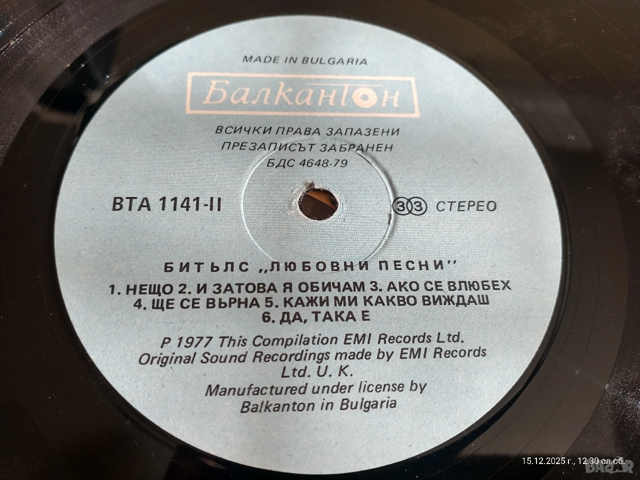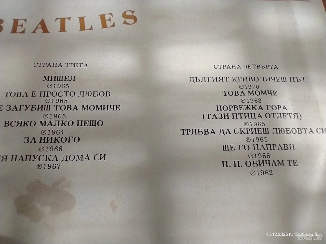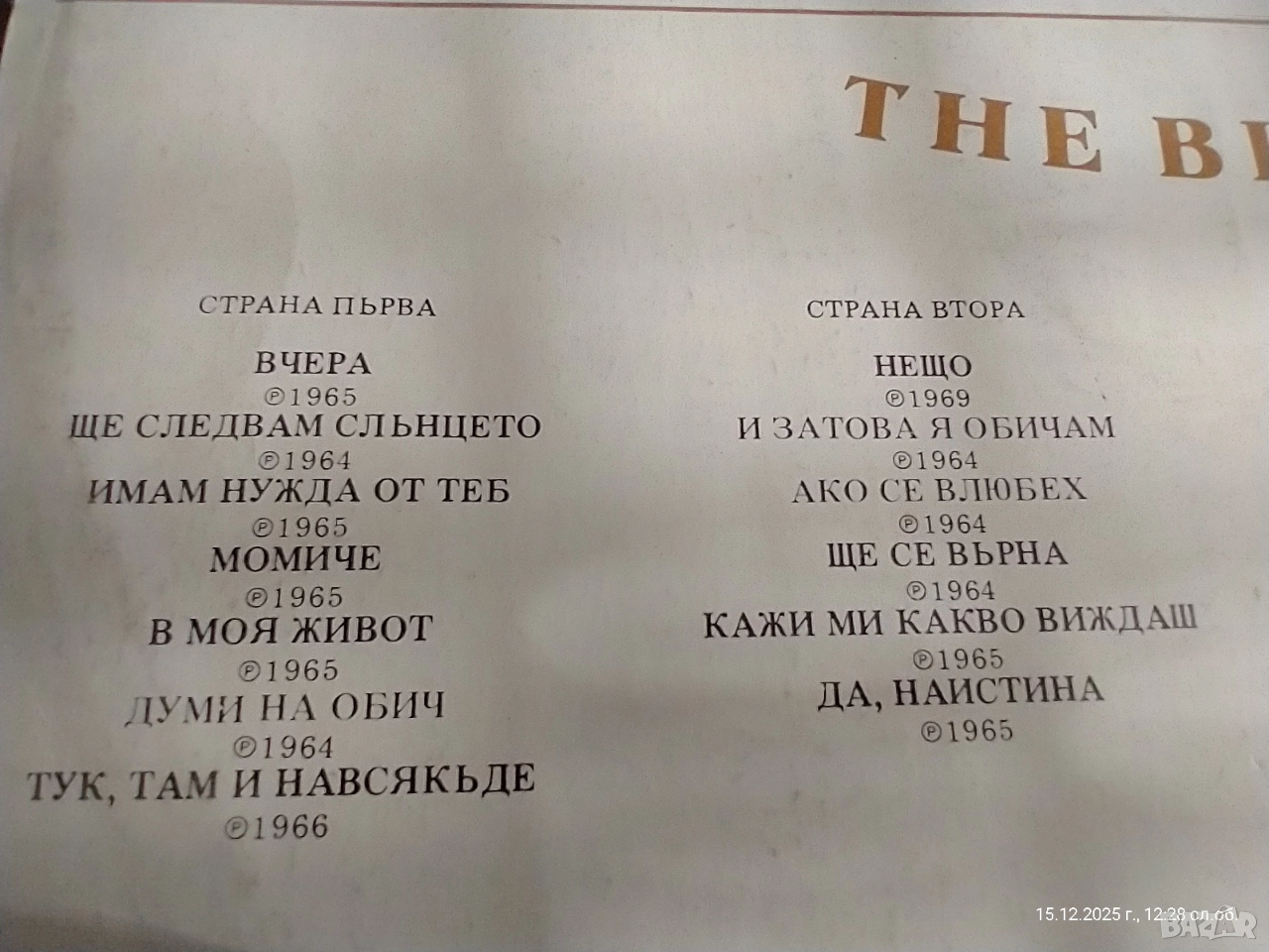 BEATLES – “LOVE SONGS” (2 LP) Balkanton / EMI Records Ltd. – BTA 1141/42 Оригинално лицензирано издание, произведено в България 1979 г. Състояние: Винили: много добри,звучат чисто Обложка: много добра,само леко зацапване отзад(вижда се на една от снимките). Етикети: отлично състояние Комплектът е пълен, двойна плоча в оригинална обложка 💿 Траклист Страна 1 (BTA 1141-1): 1. Вчера (Yesterday) 2. Ще следвам слънцето (I'll Follow the Sun) 3. Имам нужда от теб (I Need You) 4. Момиче (Girl) 5. В моя живот (In My Life) 6. Думи на обич (Words of Love) 7. Тук, там и навсякъде (Here, There and Everywhere) Страна 2 (BTA 1141-2): 1. Нещо (Something) 2. И я обичам (And I Love Her) 3. Ако се влюбя (If I Fell) 4. Ще се върна (I'll Be Back) 5. Кажи ми какво виждаш (Tell Me What You See) 6. Да, наистина (Yes It Is) Страна 3 (BTA 1142-1): 1. Мишел (Michelle) 2. Това е само любов (It's Only Love) 3. Ще загубиш момиче (You're Going to Lose That Girl) 4. Същото малко нещо (Every Little Thing) 5. За никого (For No One) 6. Щастливо у дома си (She's Leaving Home) Страна 4 (BTA 1142-2): 1. Дългият криволичещ път (The Long and Winding Road) 2. Това момче (This Boy) 3. Норвежка гора (Norwegian Wood) 4. Трябва да скриеш любовта си (You've Got to Hide Your Love Away) 5. Ще го направя (I Will) 6. П. П. Обичам те (P.S. I Love You) Производител: Balkanton по лиценз на EMI Records Ltd., U.K. Година: –1979 Каталожен номер: BTA 1141/42 Оригинално лицензирано издание, не пиратско копие! 💰 Цена: 50 лв. 📦 Лична среща или доставка с Еконт/Спиди – добре опаковано