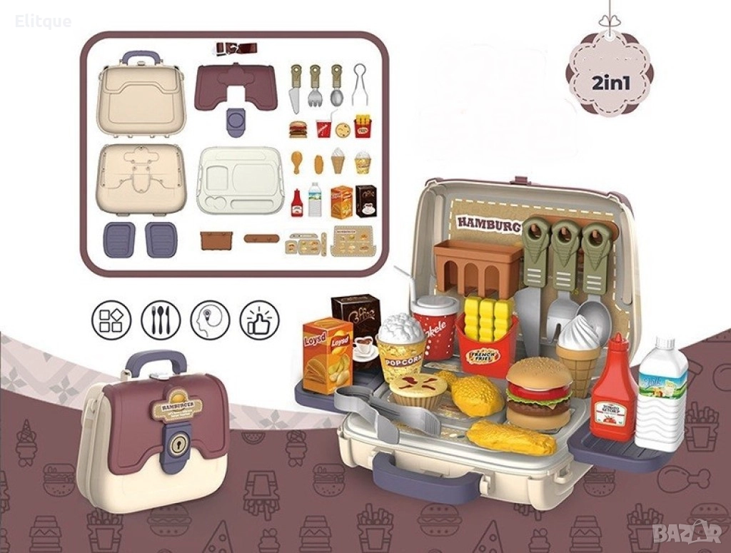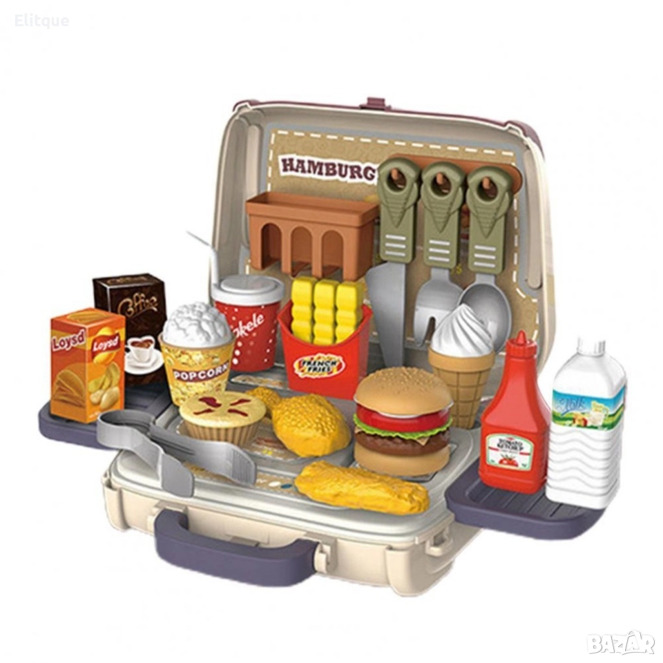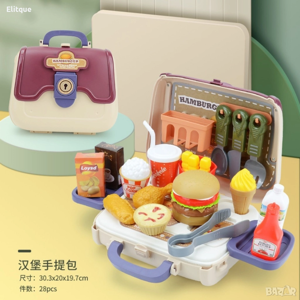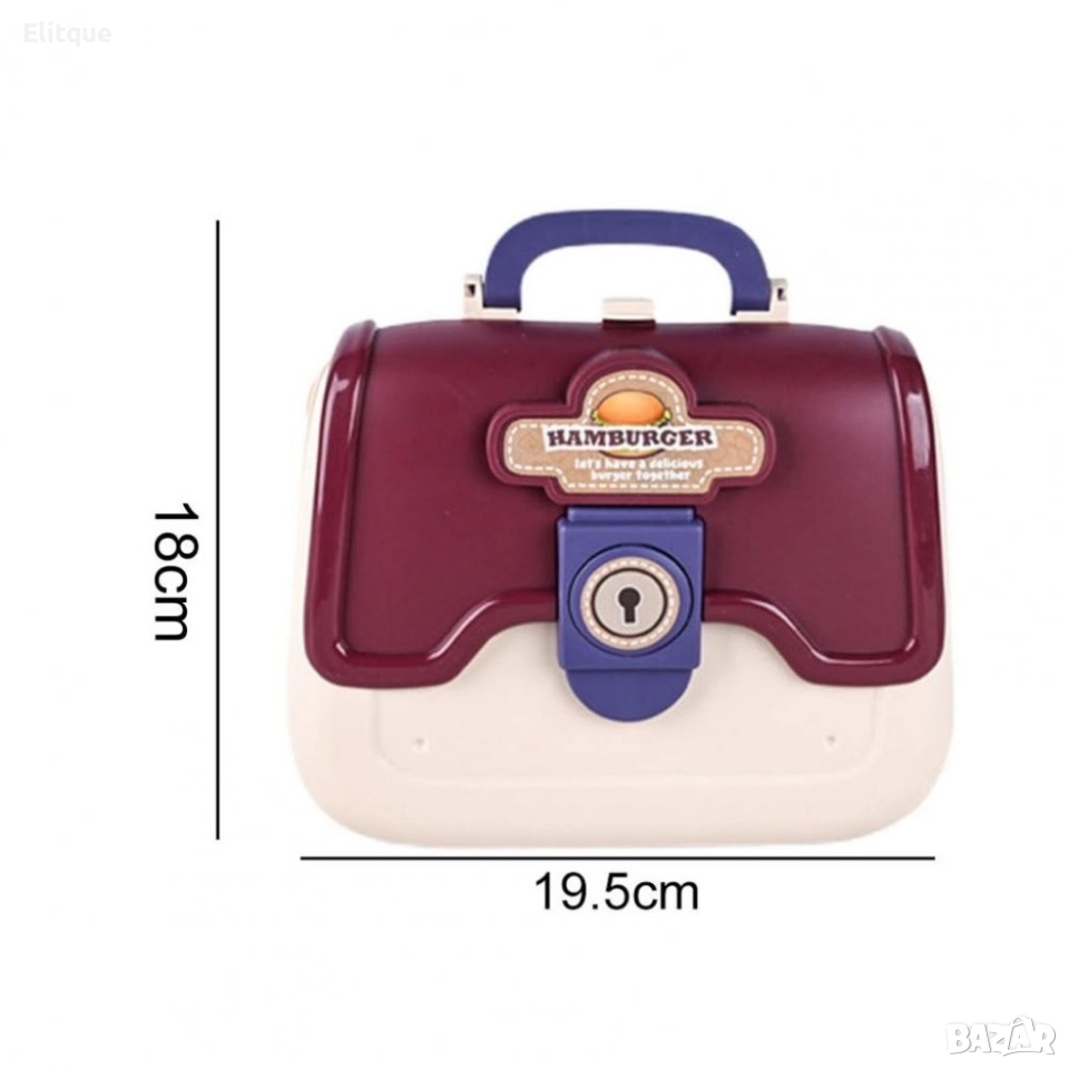Детска чанта с принадлежности - 24 броя. Размери - 19.5 x 7.5 x 18.5. Подпомага интелектуалното развитие, способността за наблюдение. Варианти - 1) За бургери - кафяво или 2) Козметичен център - розово.