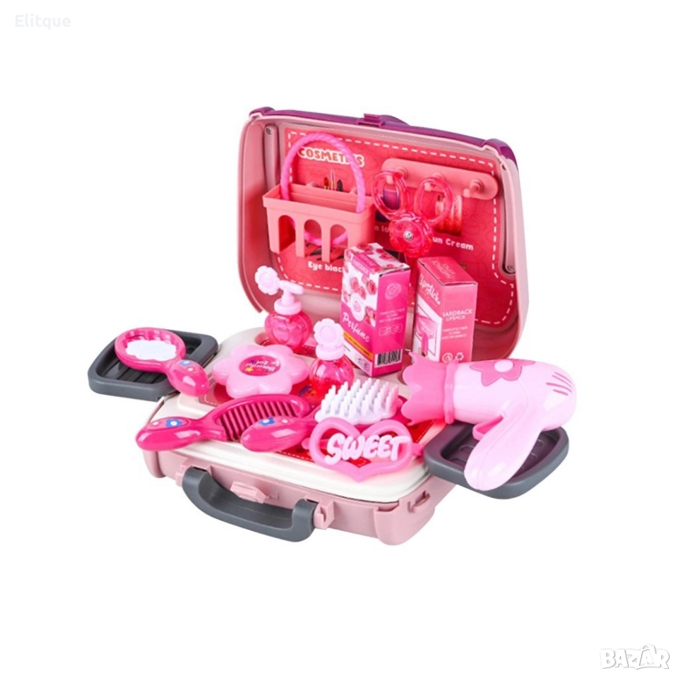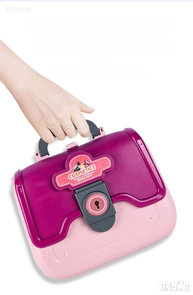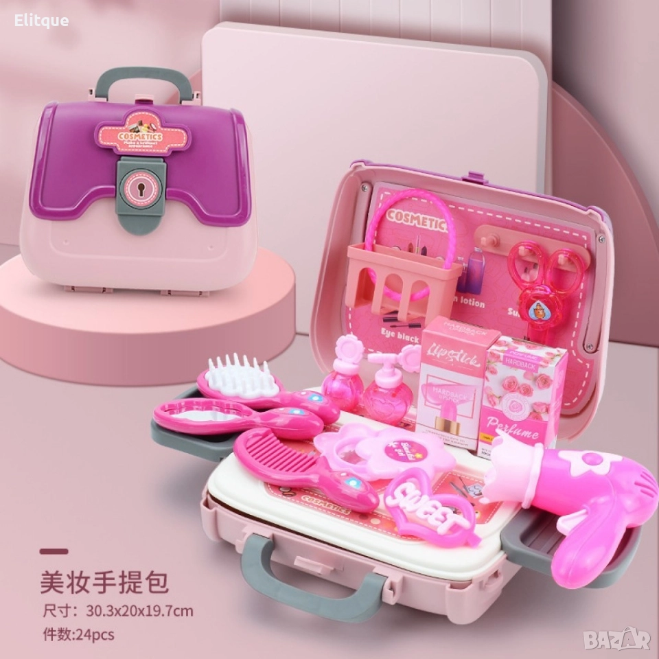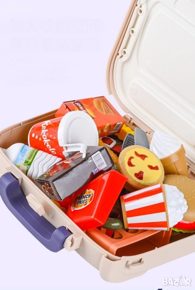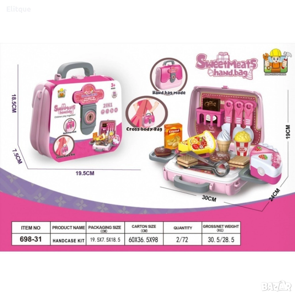 Детска чанта с принадлежности - 24 броя. Размери - 19.5 x 7.5 x 18.5. Подпомага интелектуалното развитие, способността за наблюдение. Варианти - 1) За бургери - кафяво или 2) Козметичен център - розово.