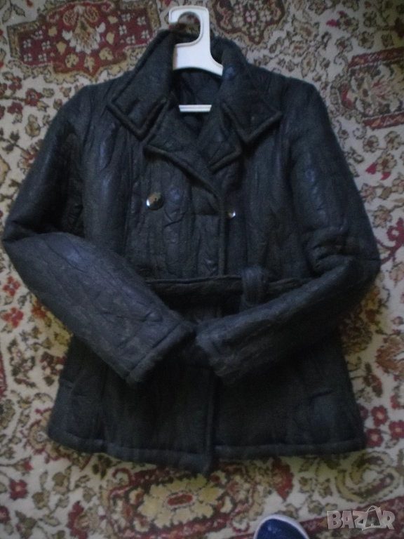 Дамско късо палто,вталено от материал наподобяващ кожа,цвят тъмносиво към черно, с подплата, не много дебела, закопчава се с копчета ,има колан,носено е броени пъти,на живо е по-красиво-на снимките се губи ефекта от плата.