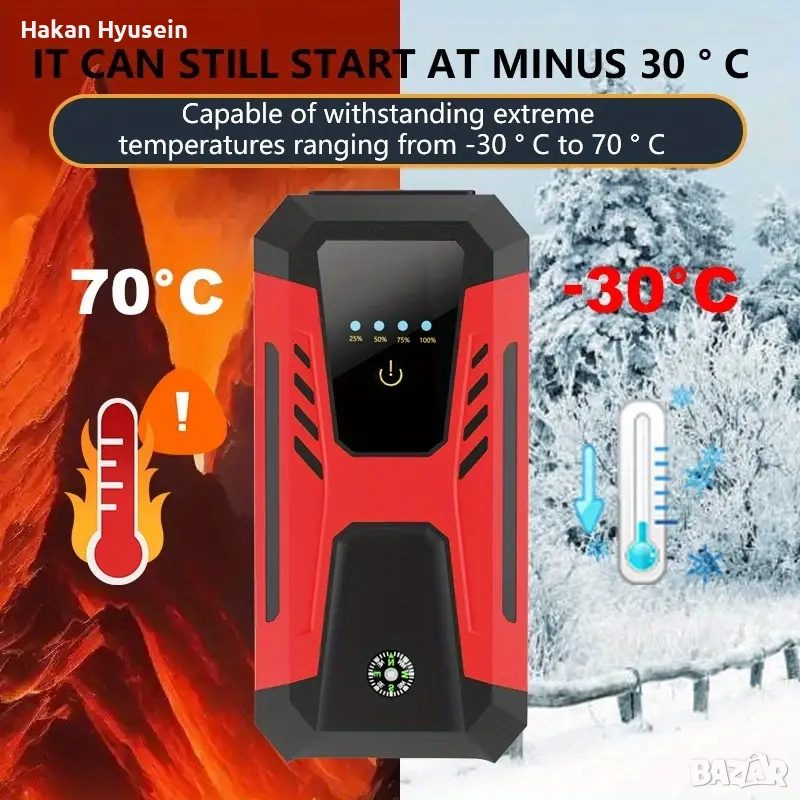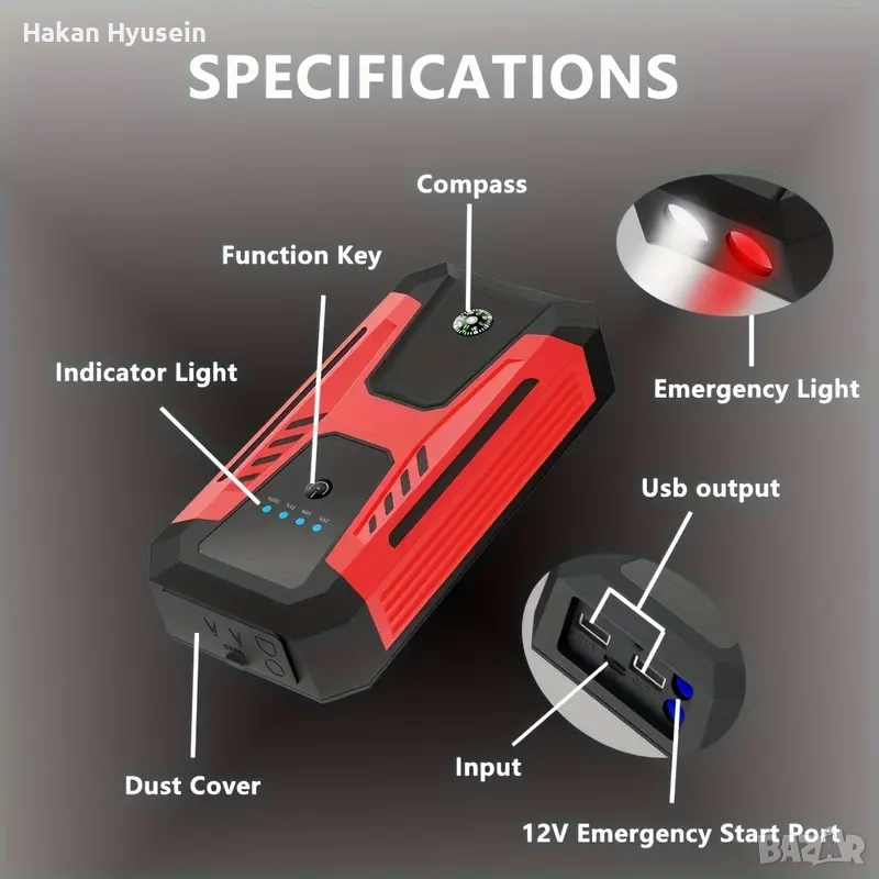 Jump starter представлява най -мощната li-po4 батерия капацитет 39000mAH Която е годна за подаване на ток на автомобил (или бус) с 12волта система, за стартиране директно без зареждане ( също като подаване от друг автомобил със щипки). При напълно заредена батерия можете да стартирате около 15- 20пъти автомобил.