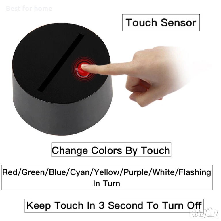 * Сензорен бутон: Натиснете веднъж, един цвят светва, натиснете отново, изключва се. Натиснете трети път, друг цвят светва.