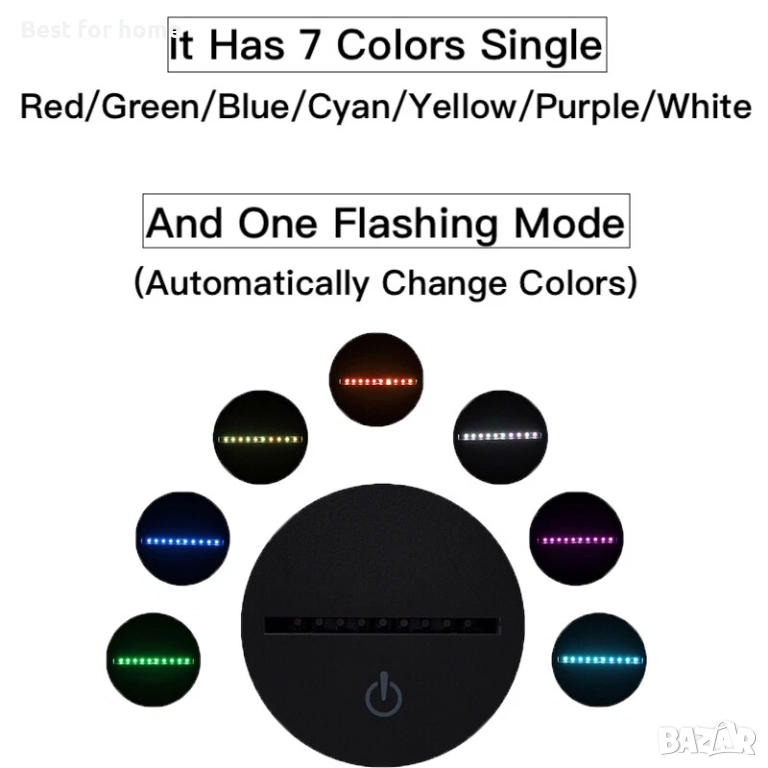 * 7 променящи се цвята: Червено, Зелено, Синьо, Жълто, Циан, Розово, Бяло
