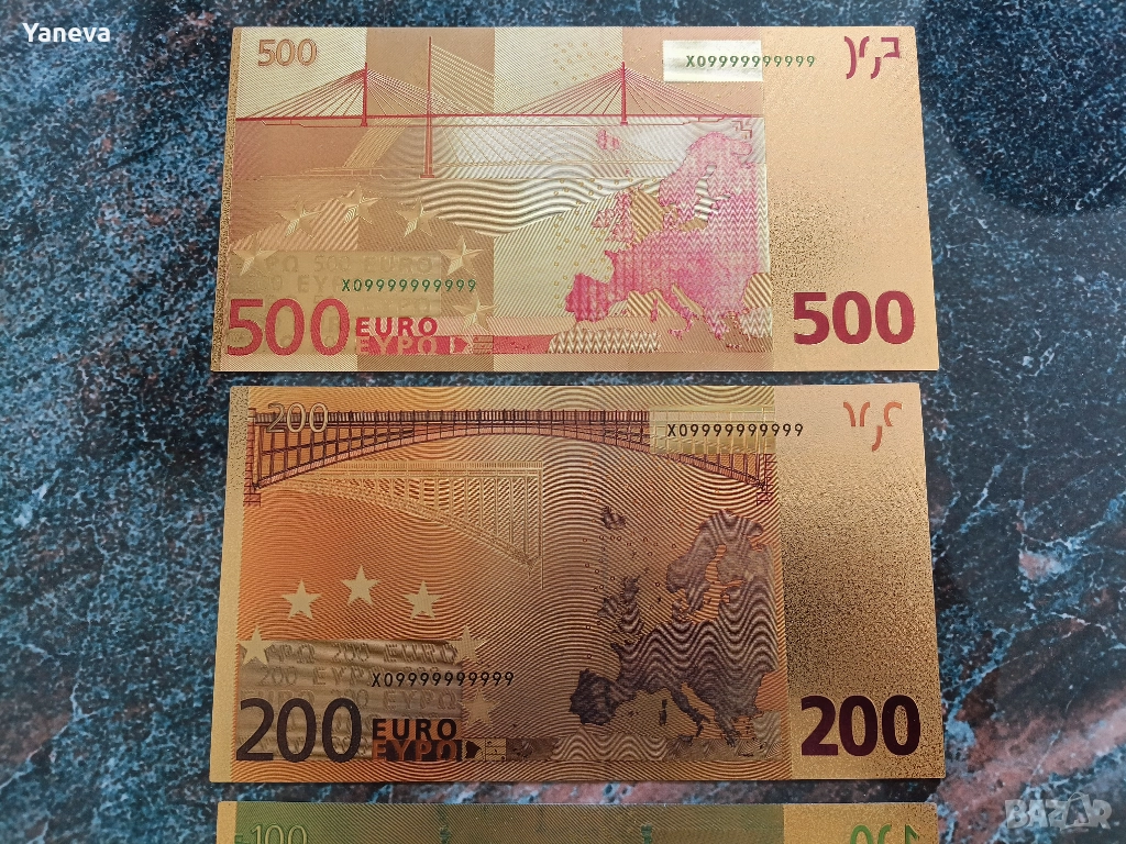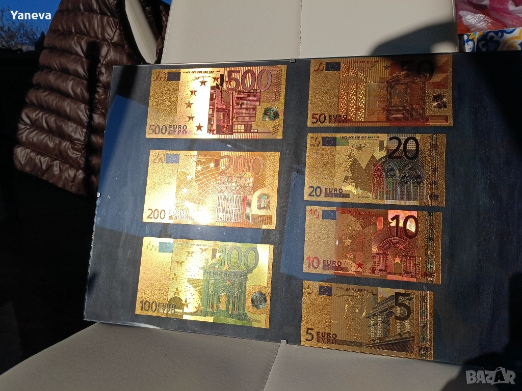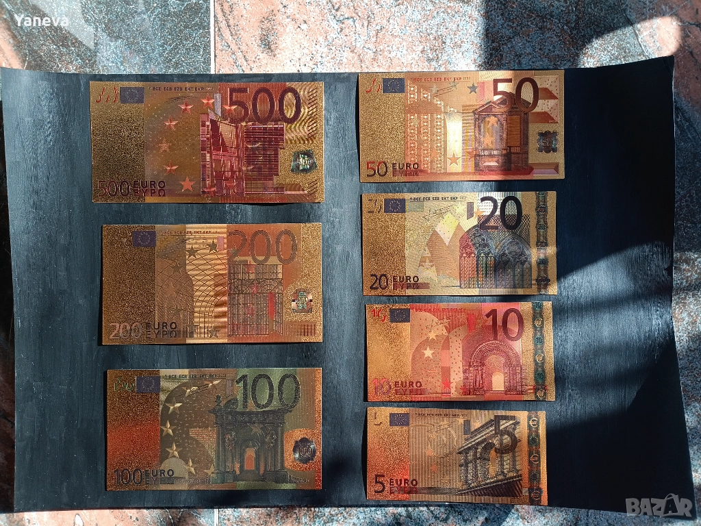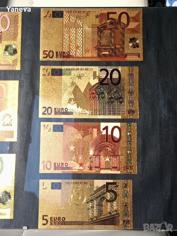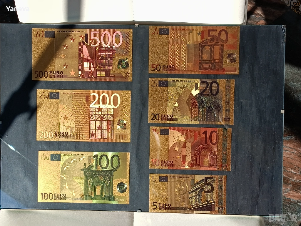 Евро банкноти, златисти , двустранни плакети в рамка с размер 45 / 30 см. → Обява 52800775