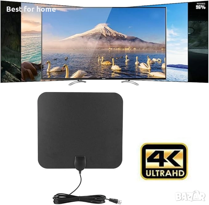 4K HD телевизионна антена с усилване 25 dBi. Може да се използва в много сцени, например зад телевизора, поставена плоско на масата, залепена на прозореца (препоръчително) и залепена на стената.