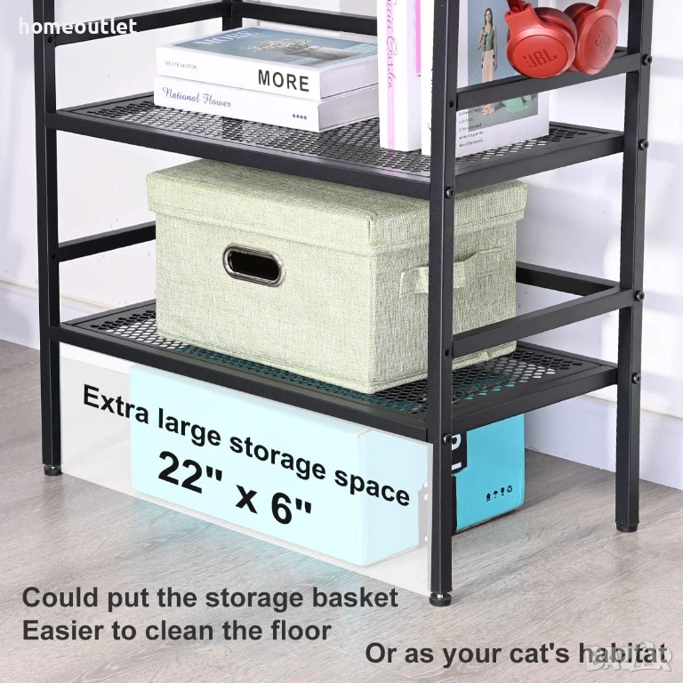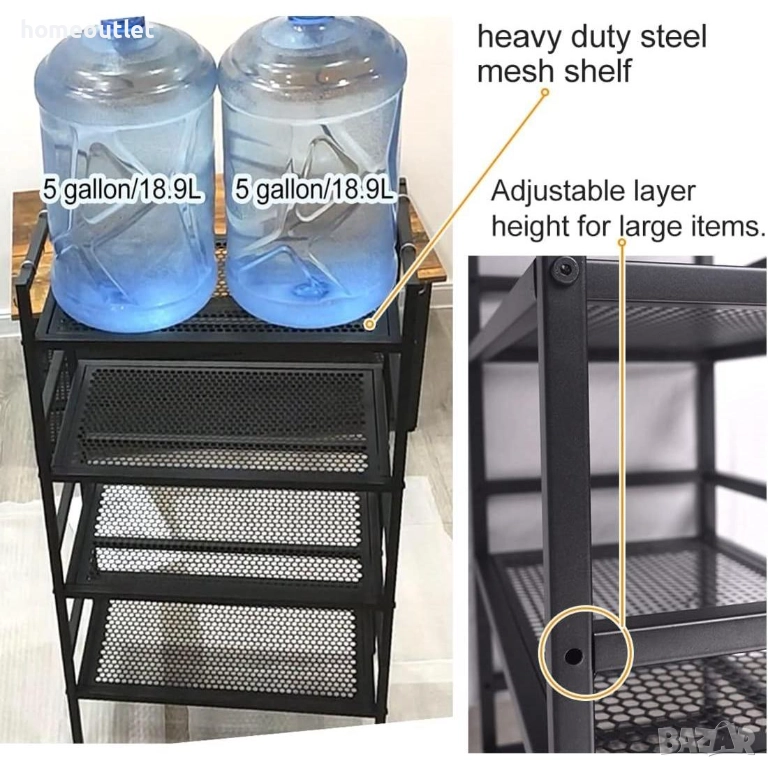 Всяко ниво на металния стелаж разполага с приблизително 22.5 см разстояние между рафтовете, което осигурява удобство при подреждане на различни вещи.