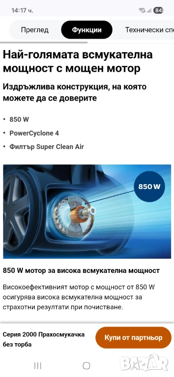 Мощен мотор: 850 W за силно всмукване и ефективно почистване.