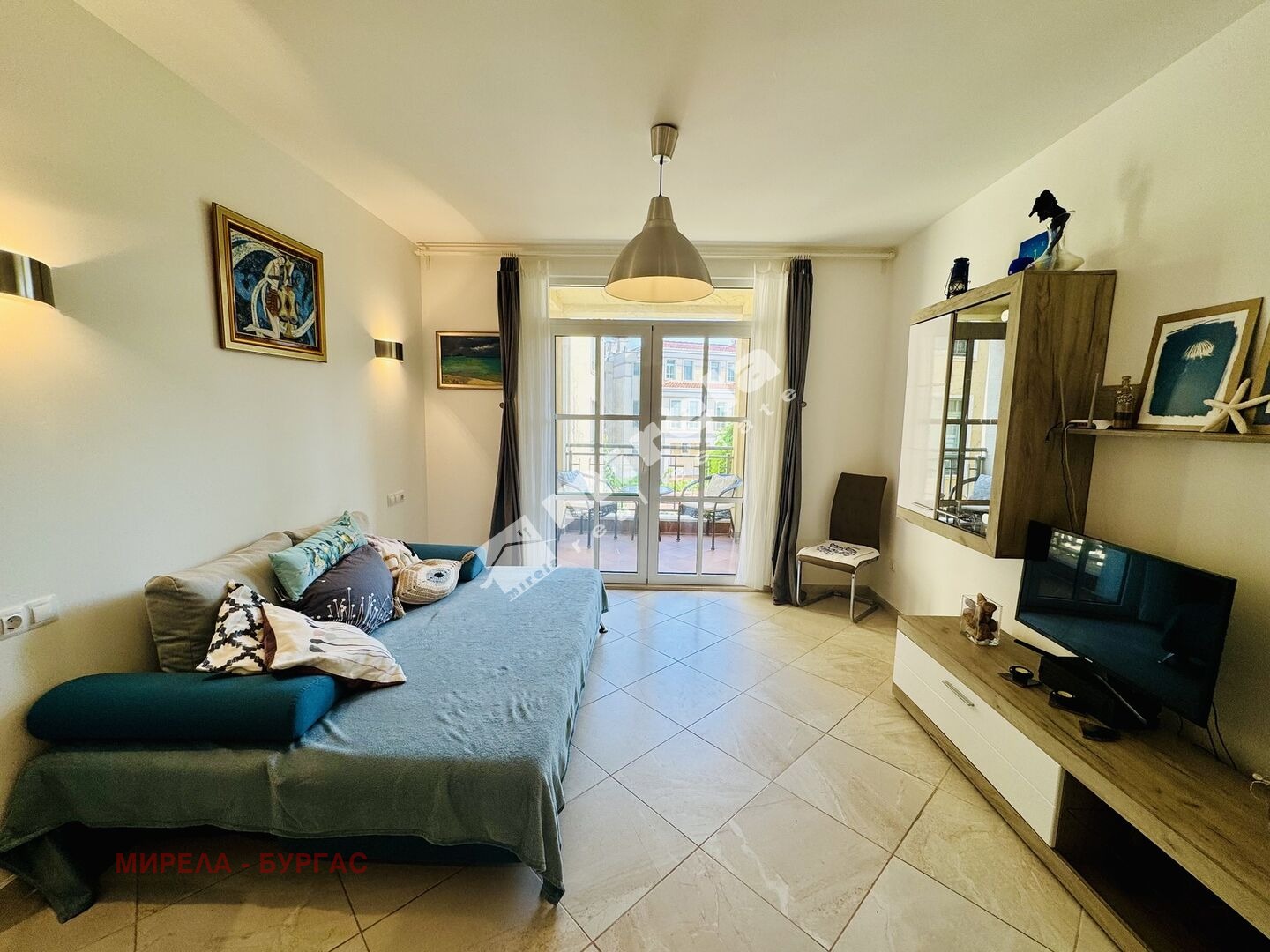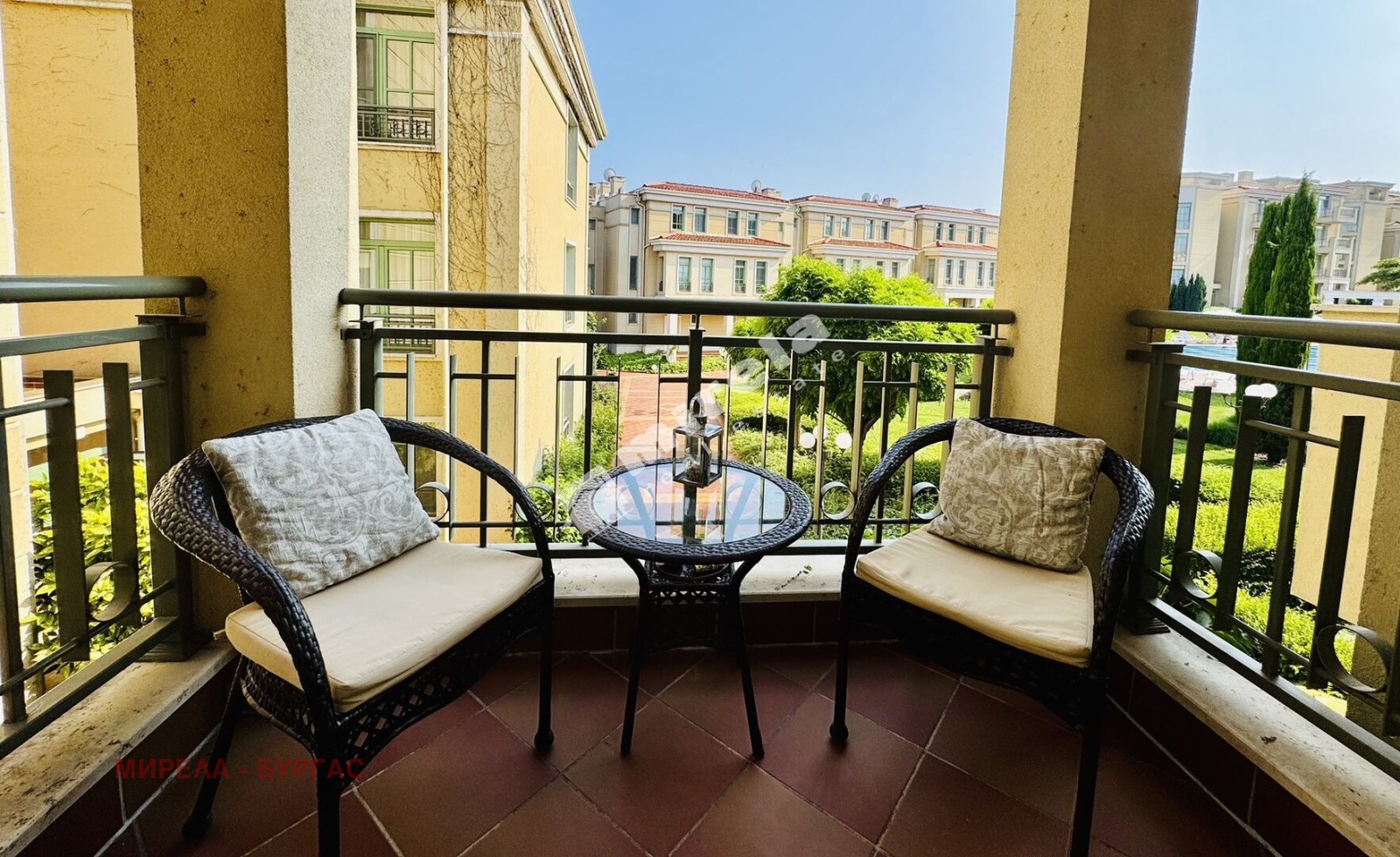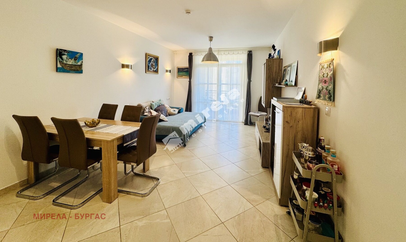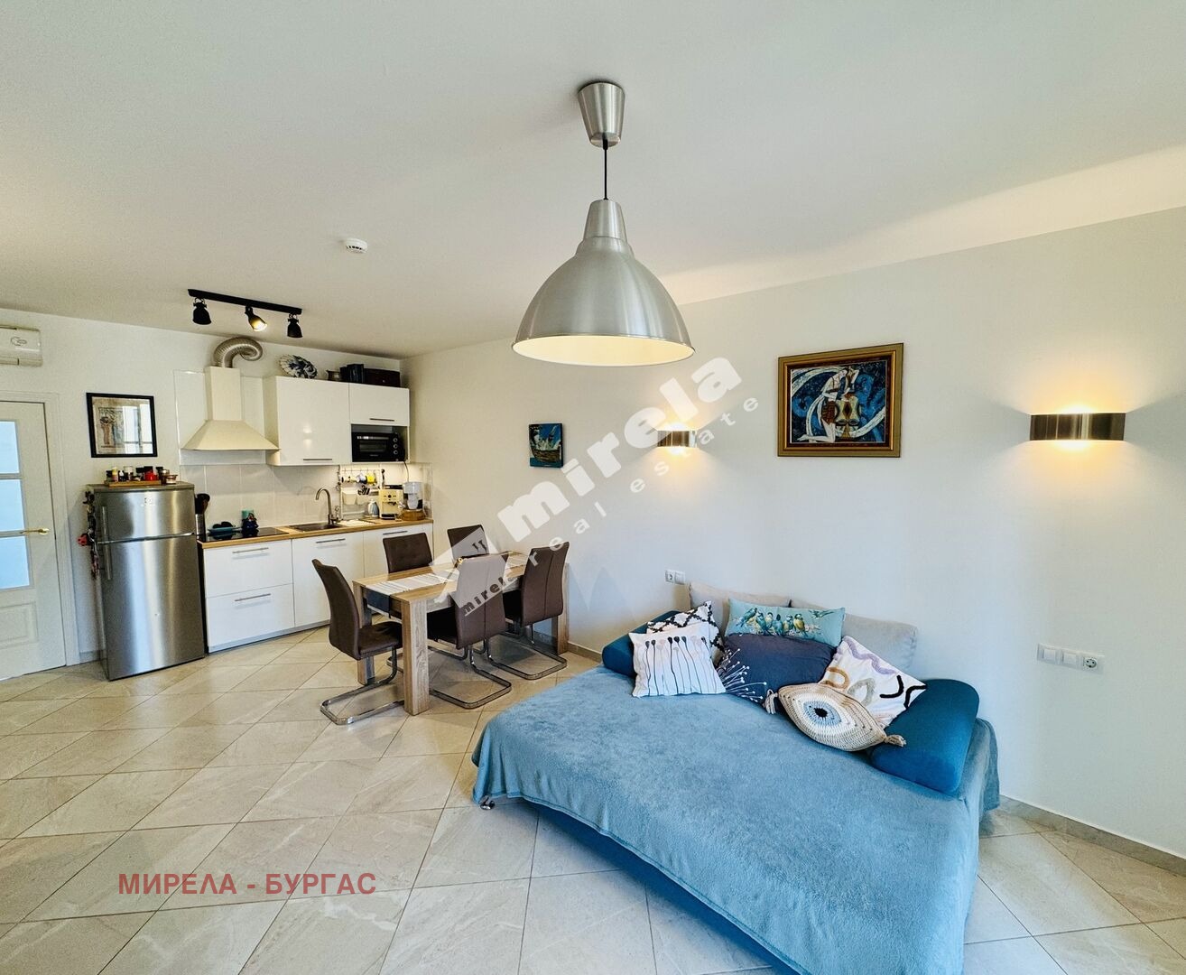 Самото жилище се отличава с просторни помещения, прекрасна гледка към морето и към басейна в комплекса. Разпределението е функционално, обзавеждането съвременно. Състои се от антре, дневна с кухня, самостоятелна спалня, светла баня с тоаелетна и два балкона. Единият - с южно изложение и гледка към басейна, и втори - северозападен - с гледка към морето.