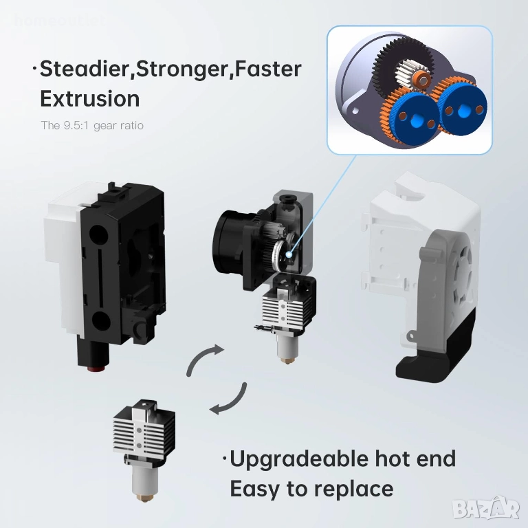 До 300°C директен екструдер с предавателно число 9.5:1;