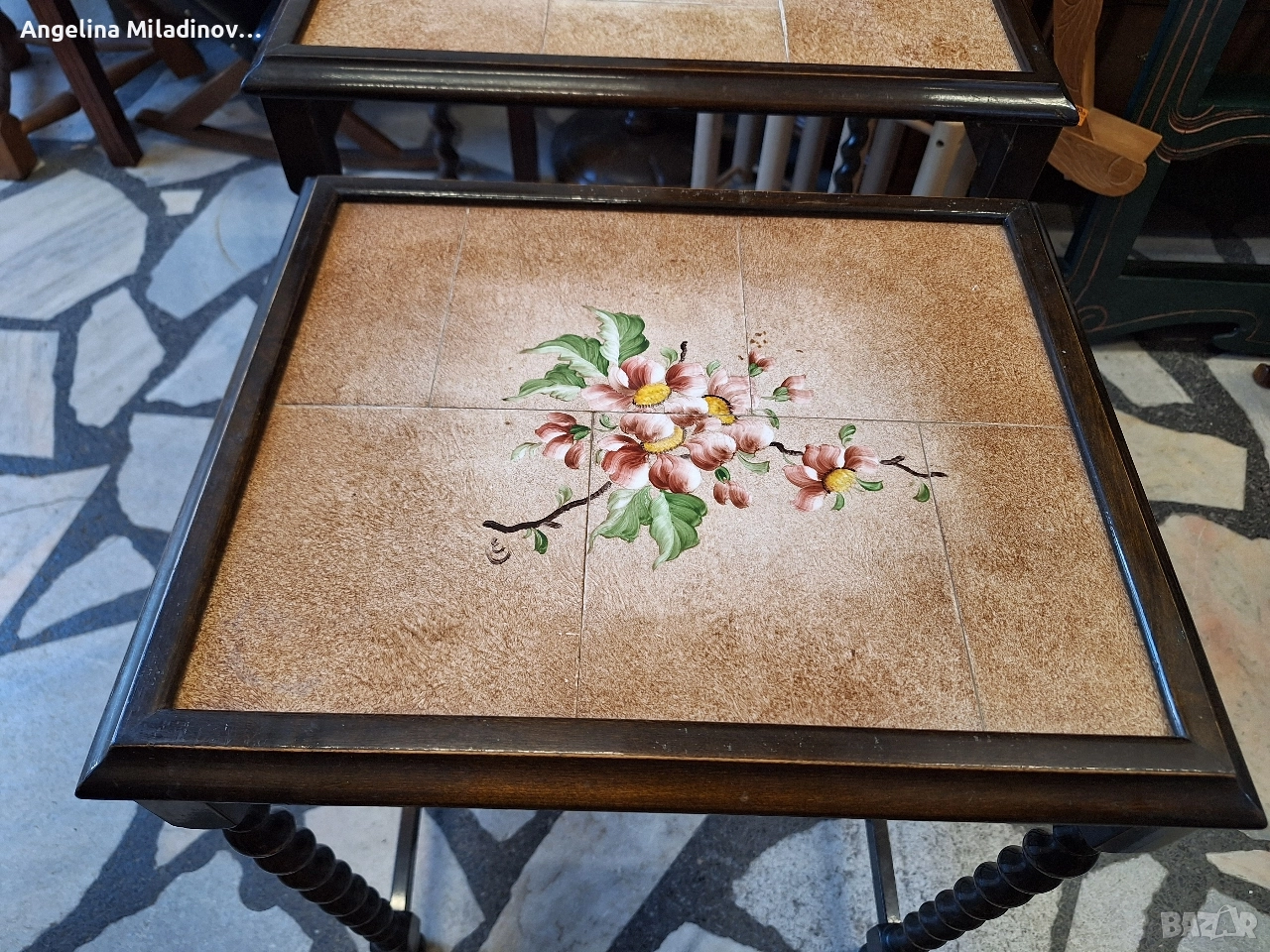 К - т три помощни масички с плочки. Тройка помощни масички с порцеланови плочки, внос от Дания. Трите масички влизат чрез улеи една под друга. Удобни за всекидневна, тераса, веранда или друга част от дома ви. Отлично състояние. Разгледайте и другите ми обяви. Последвайте ни и във фейсбук Мебели шик. Предлагаме и изгоден транспорт за цялата страна. Размери: Голяма - 51/43/55 см. Средна - 35/43/53 см. Малка - 36/28/50 см. Цена - 133 € 260,13 лв.