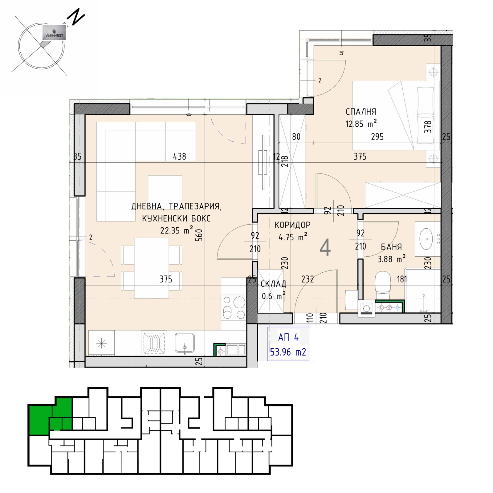 Апартаментът /Ап.4, Вх.Б/ е с площ от 60,90 кв.м. и е на партерно ниво.