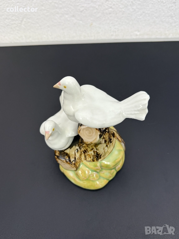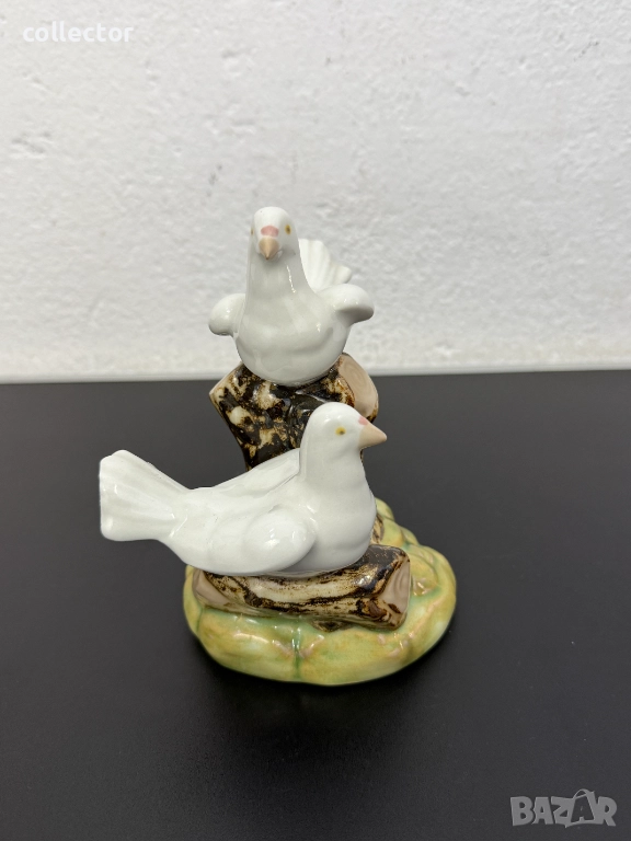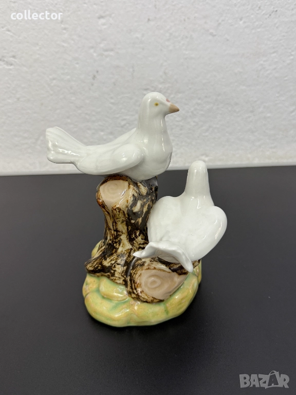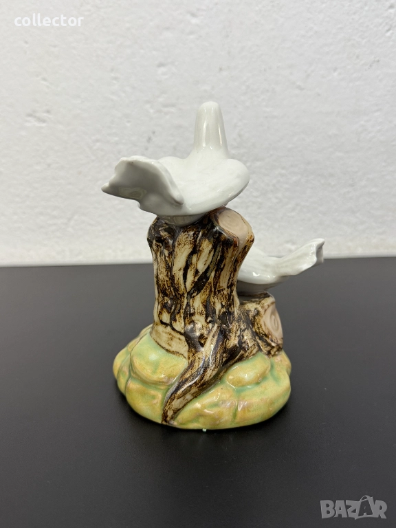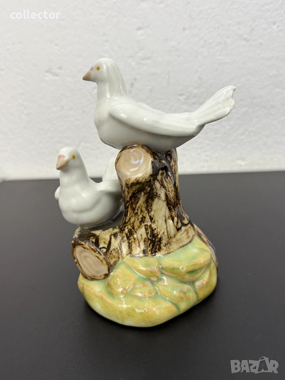 Порцеланова фигурка Tengra, изобразяваща два гълъба, седнали на пън. Фирма производител - Tengra, испанска компания от Валенсия, която произвежда порцеланови изделия.