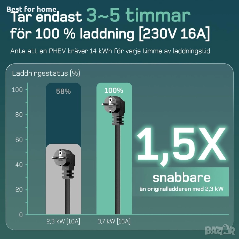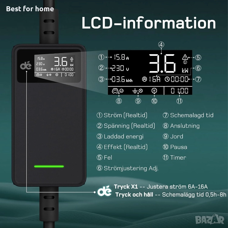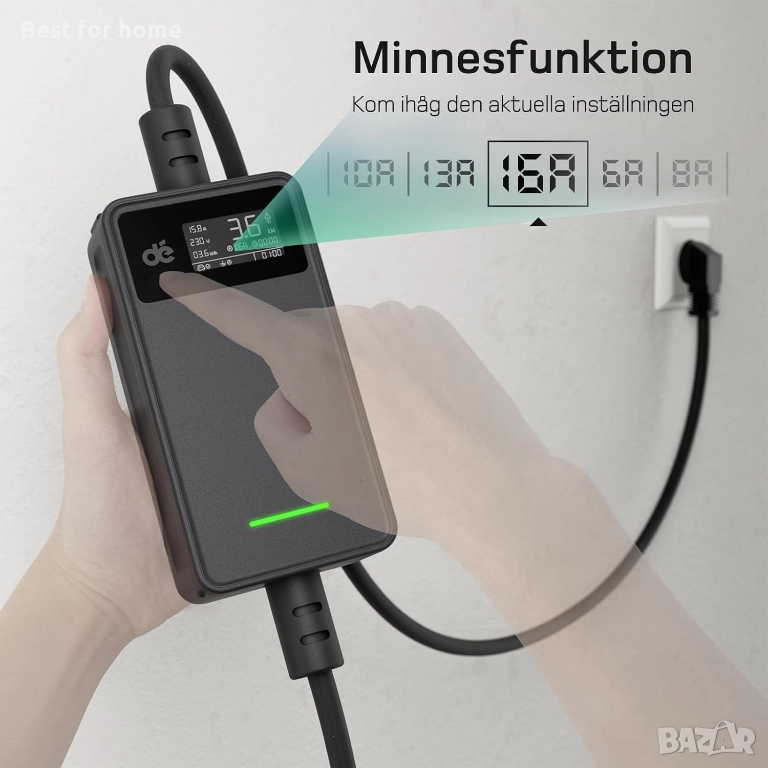 【Зареждайте по-бързо, тръгвайте по-рано】 Зарядното устройство за електрически автомобили "dé" е 1,5 пъти по-бързо от традиционните модели и значително намалява времето за зареждане. С 16-A Schuko контакт и регулируем ток между 6A и 16A, то предлага гъвкавост, която да отговаря на вашите нужди. С до 3,7 kW на час (230 V x 16 A), то зарежда вашия PHEV от 0% до 100% за 3-5 часа. Кажете сбогом на дългото време на чакане и се зарадвайте на повече време на път.