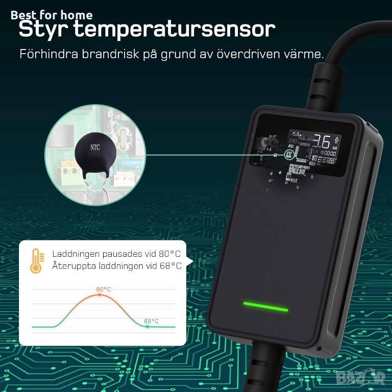 【Издръжливо и надеждно】Изработено от издръжлив TPU материал, зарядното устройство за електрически превозни средства "dé" е оборудвано с широка гама от защити за безопасност, включително претоварване по ток, под/пренапрежение, теч, прегряване, заземяване и късо съединение, осигурявайки висока надеждност. Зарядното устройство е сертифицирано и по стандартите CE, TUV и IEC. Изпитайте безпроблемна свързаност, изключителна издръжливост и спокойствие със зарядното устройство за електрически превозни средства "dé".