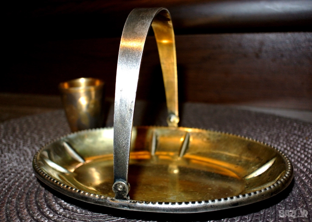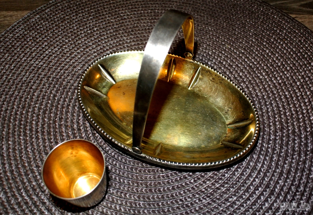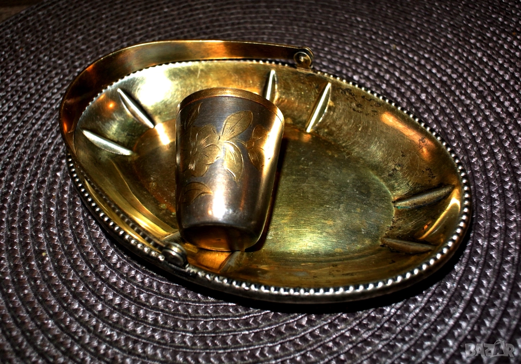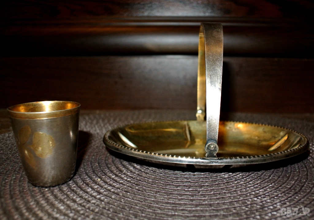 Изящна, винтидж, старинна , бонбониера ,купа за бонбони с посребряване и вътрешна позлата ! Произведена СССР от легендарната бижутерийна фабрика в Талин маркировка Т32met ! Към нея и красива винтидж чаша за шот инкрустация цвете с печат на дъното (слабо се вижда) от 60-те години ! За хора където харесват старите вещи и за отличен декор украса !!!