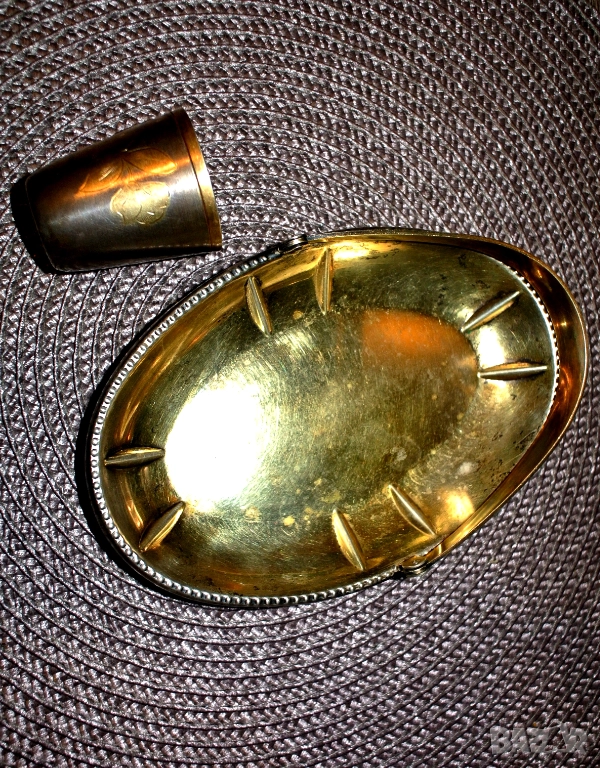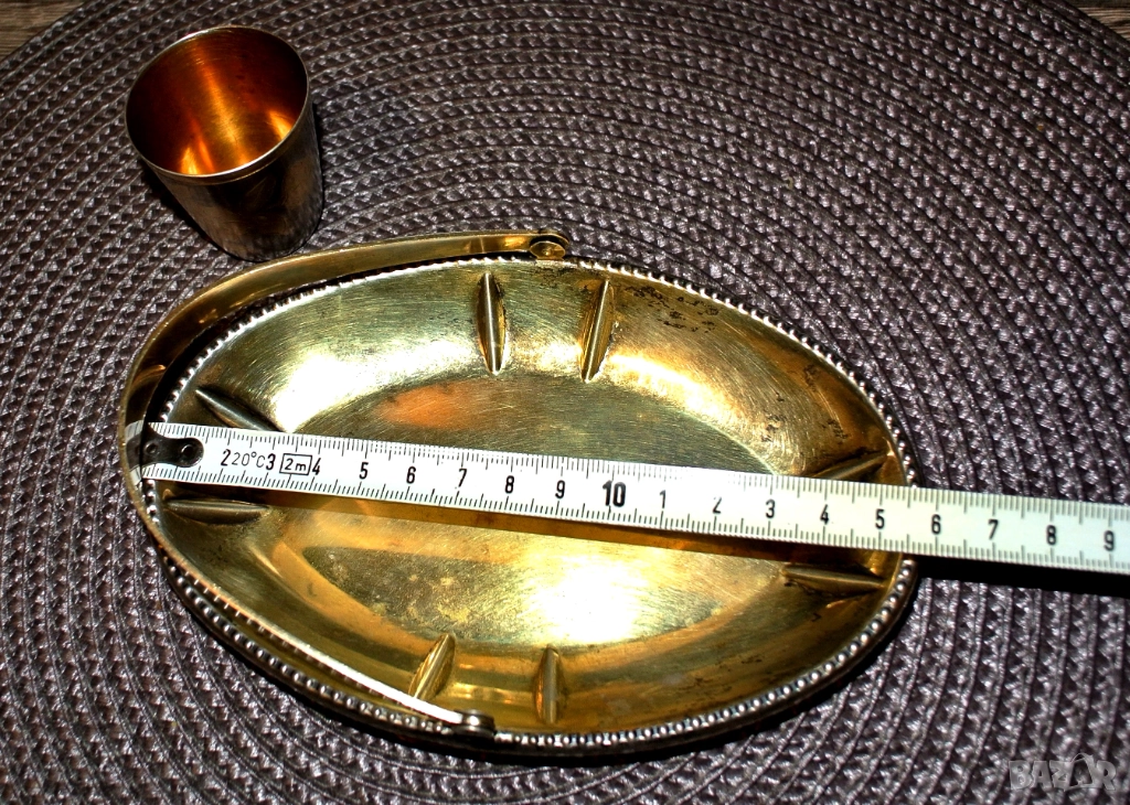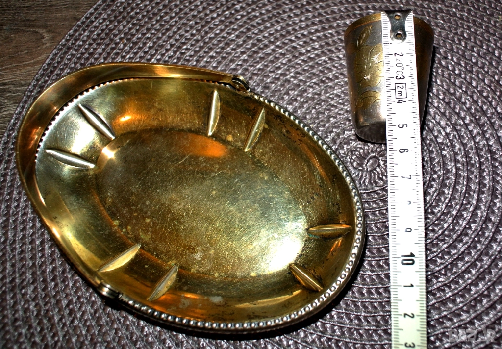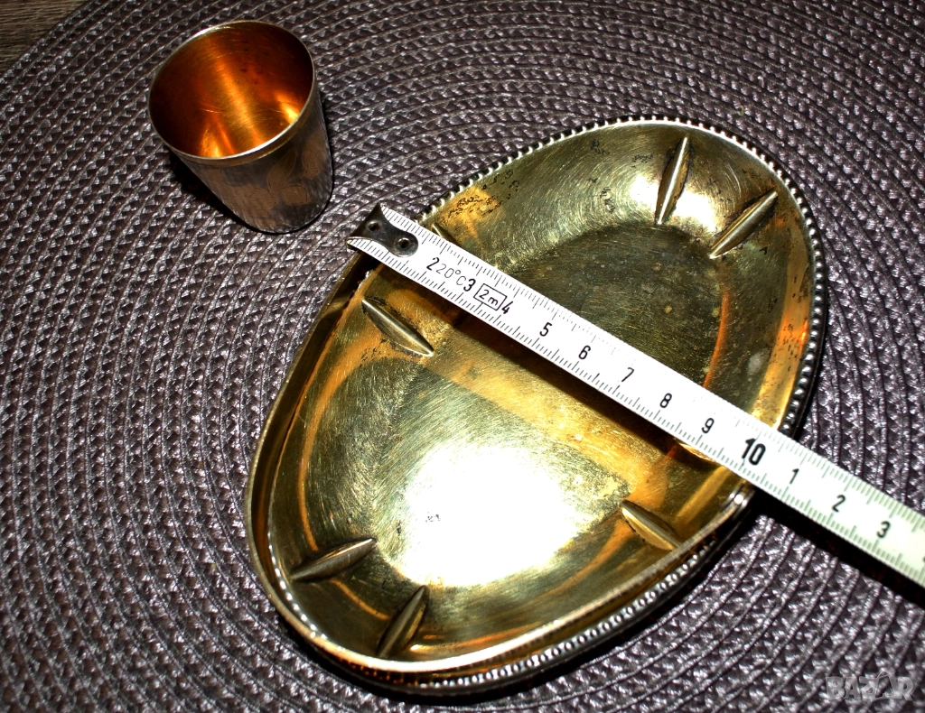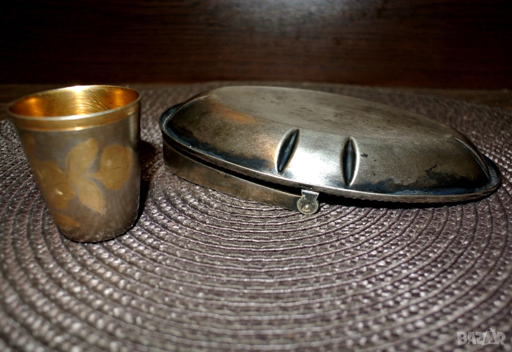 Изящна, винтидж, старинна , бонбониера ,купа за бонбони с посребряване и вътрешна позлата ! Произведена СССР от легендарната бижутерийна фабрика в Талин маркировка Т32met ! Към нея и красива винтидж чаша за шот инкрустация цвете с печат на дъното (слабо се вижда) от 60-те години ! За хора където харесват старите вещи и за отличен декор украса !!!