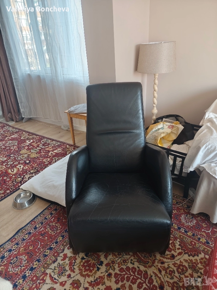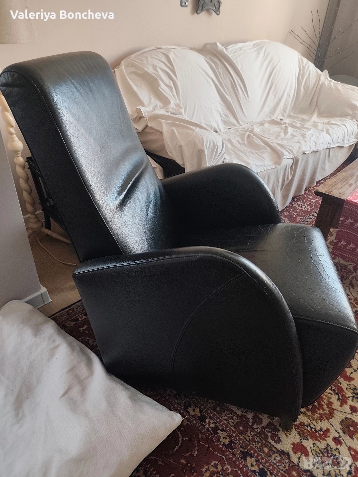 Удобно и практично кожено кресло в черен цвят. Подходящо за релаксиране и отдих в дома. Добре поддържано и с минимални следи от употреба.