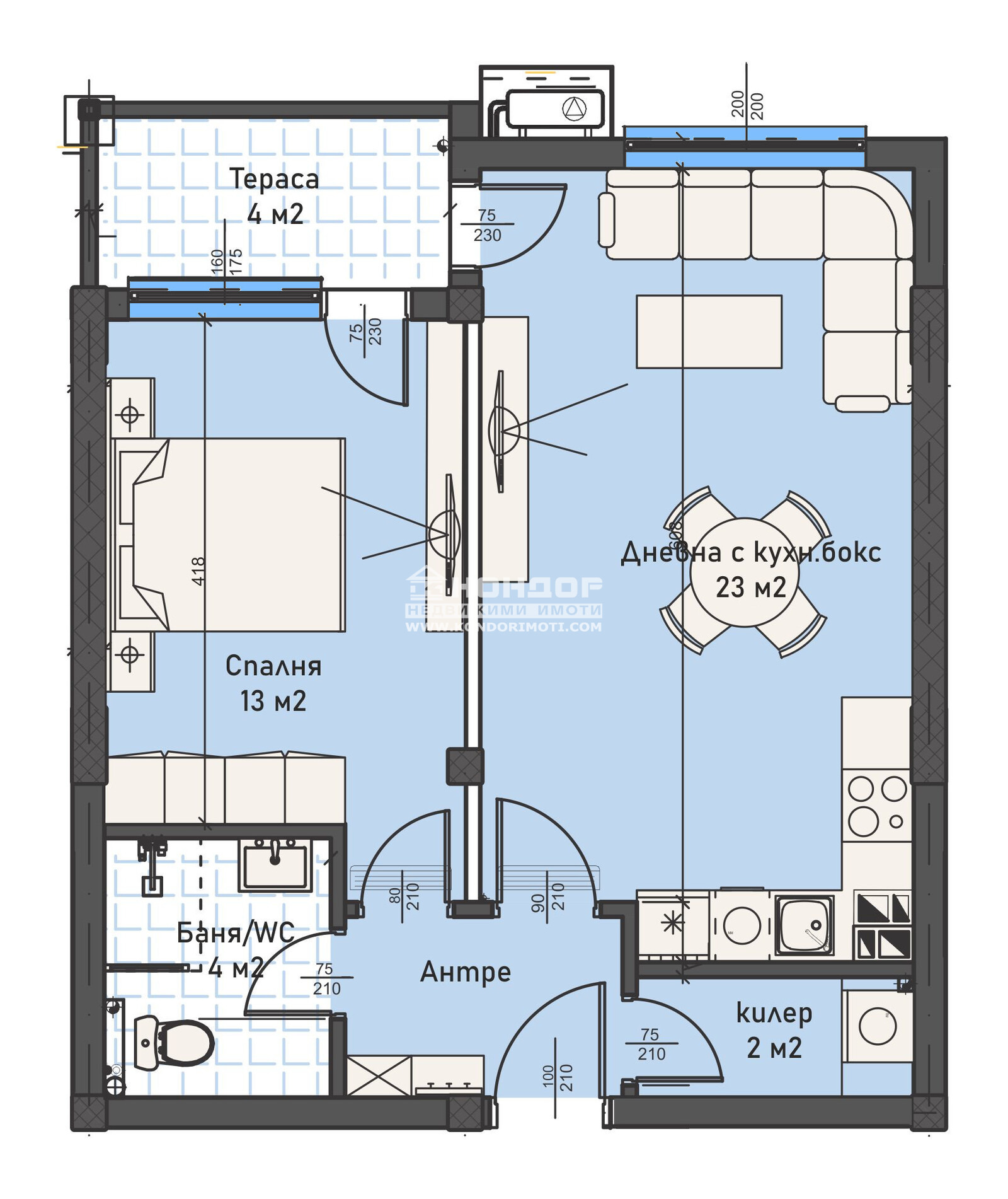 Оферта 68502 - Бутиков затворен жилищен комплекс с модерна и устойчива архитектура, потопена в богато озеленени площи, вдъхващи на живущите комфорт и спокойствие. Комплекса предлага просторна спокойна среда с бърз достъп до центъра на града, както и възлови булеварди. Предлагаме ви двустаен апартамент, състои се от дневна 23кв.м. с трапезария и кухненска част, самостоятелна спалня 13кв.м., баня с тоалетна, входно антре с място за гардероб, склад и една обща тераса. В близост са ситуирани ресторанти, хипермаркети, училища и детски градини. Ще бъдат изградени луксозни общи части с предоставено облагородено дворно място, пейки за отдих и детски площадки за игра.