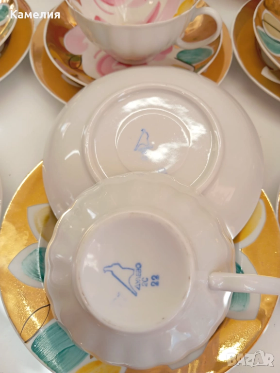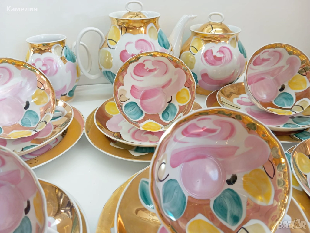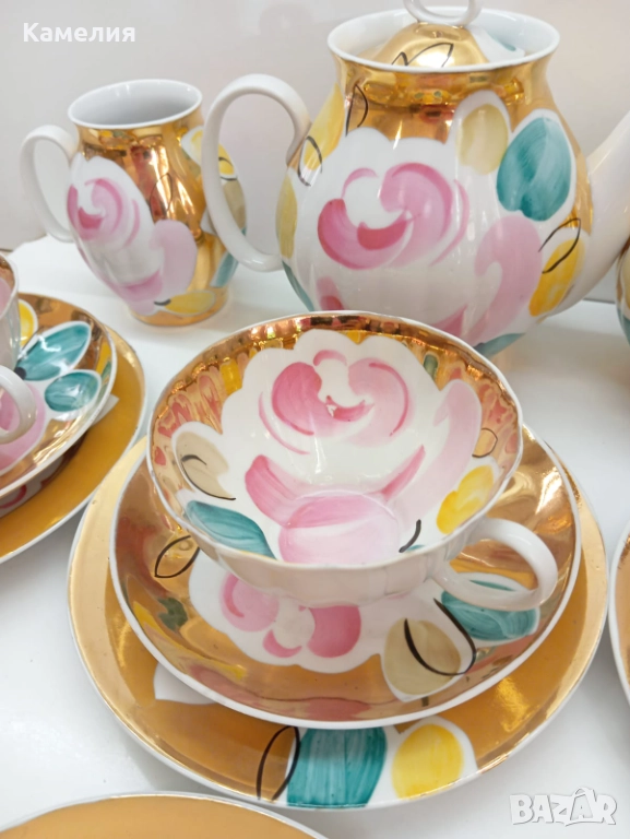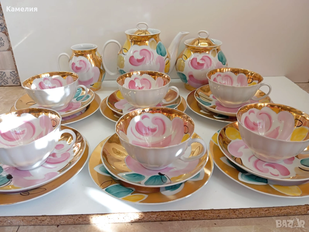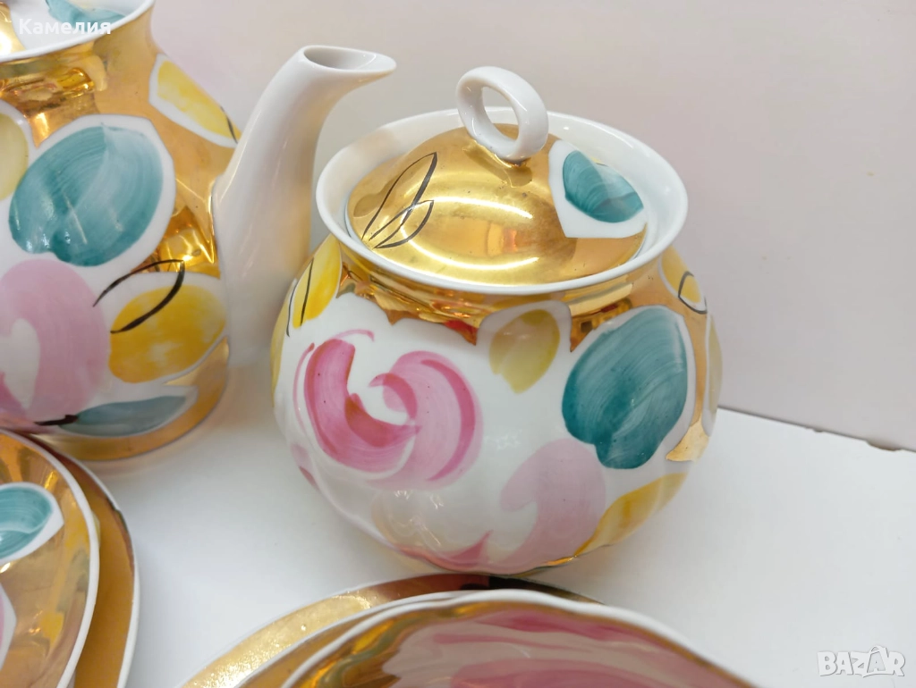 Красив сервиз за чай Златен букет. Дулево. Происход СССР. Форма Бял лебед. Ръчно рисувано. Чайник, захарница, латиера, 6 големи, чаши 280 мл, 6 чинийки, 6 десертни чинии. Много добро състояние за годините. Без чукнато и пукнато, малки фабрични несъвършенства по боя. В СССР сервиз струваше 150 рубла (цяла заплата).